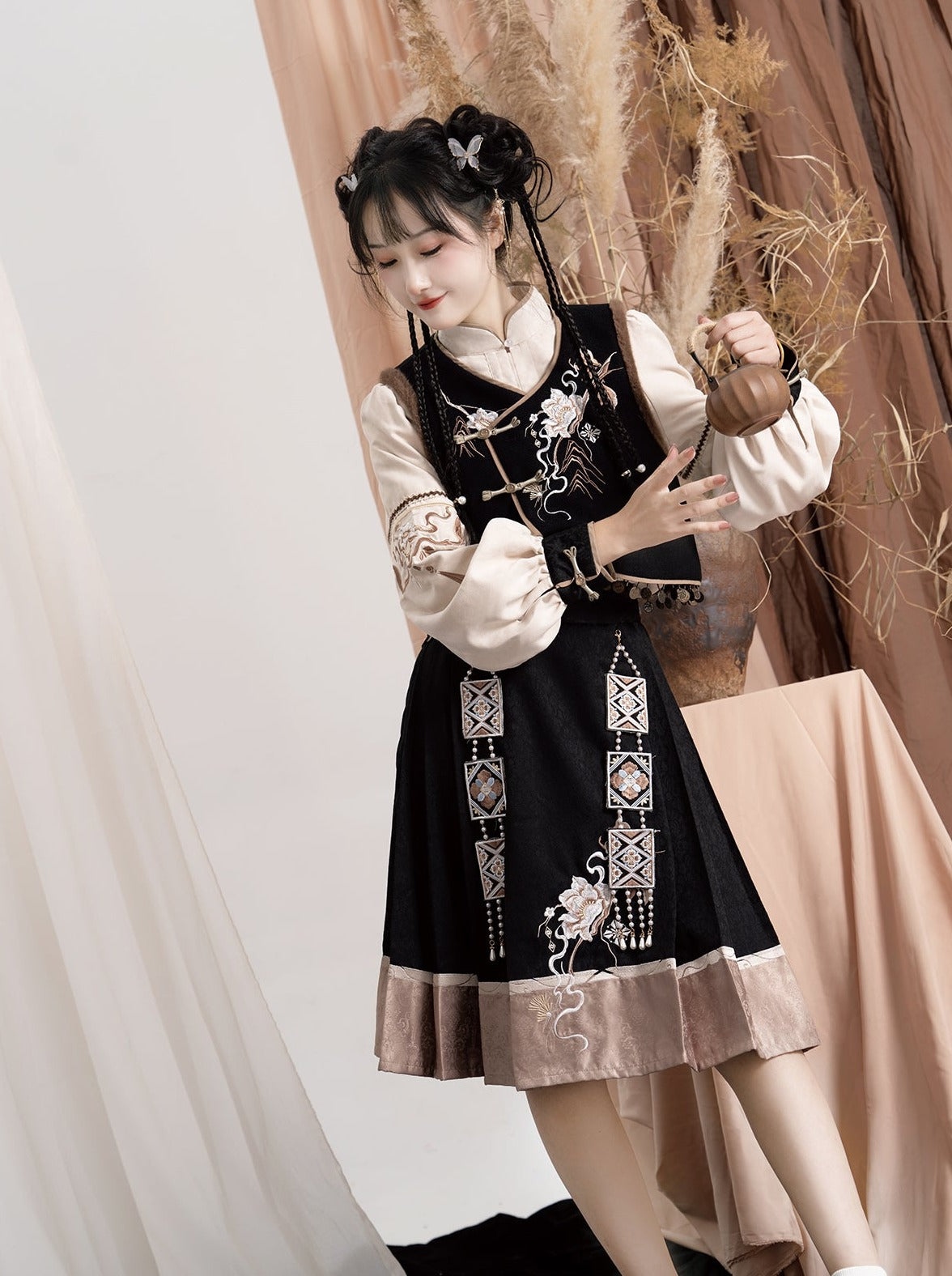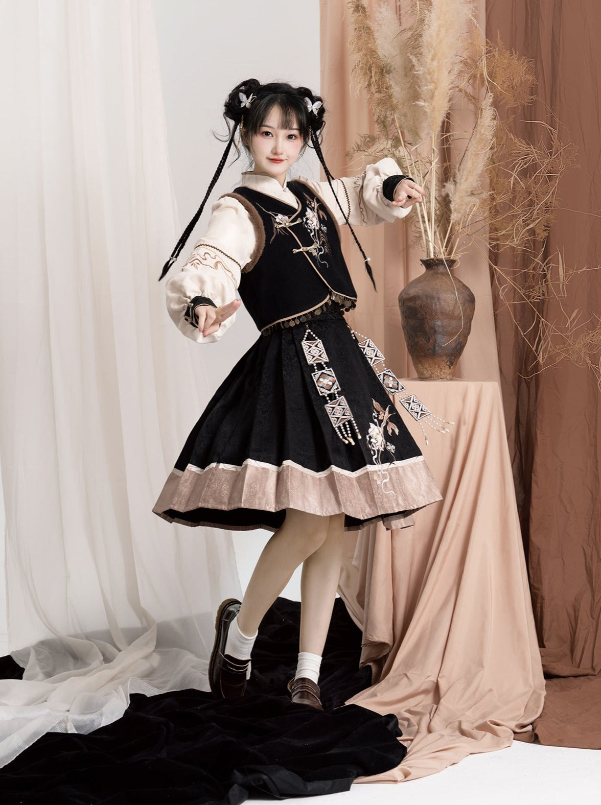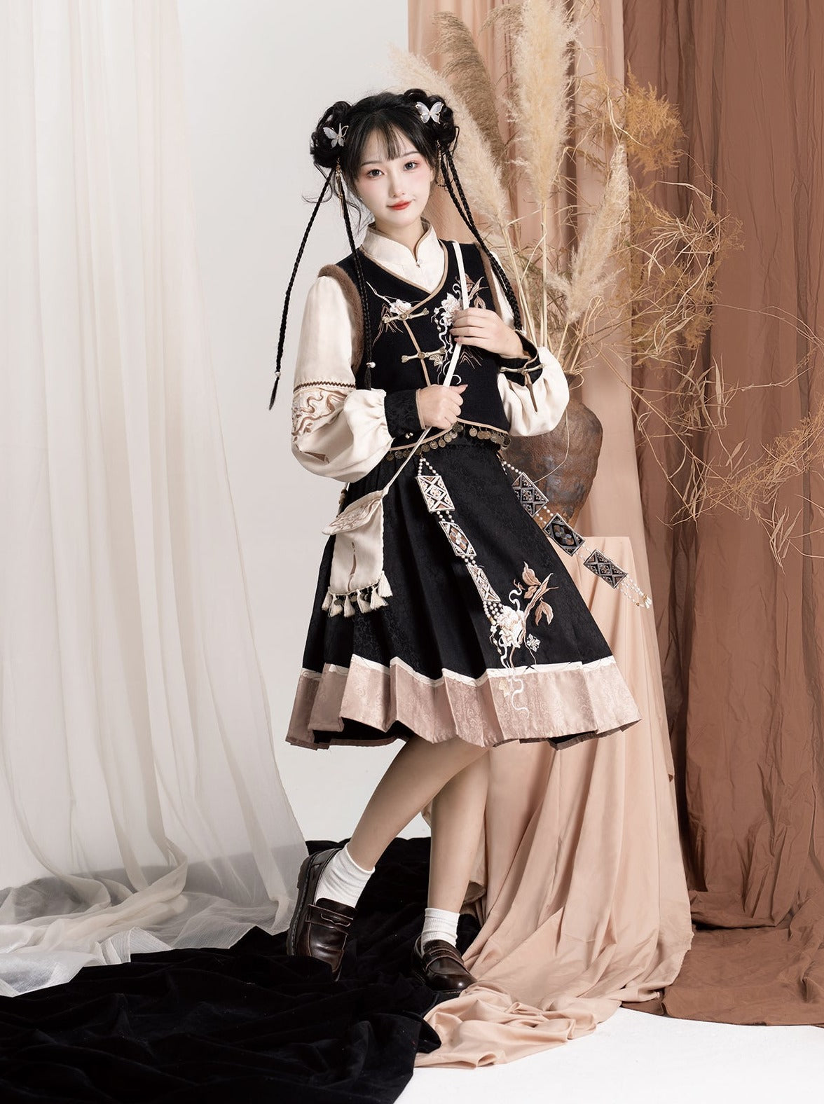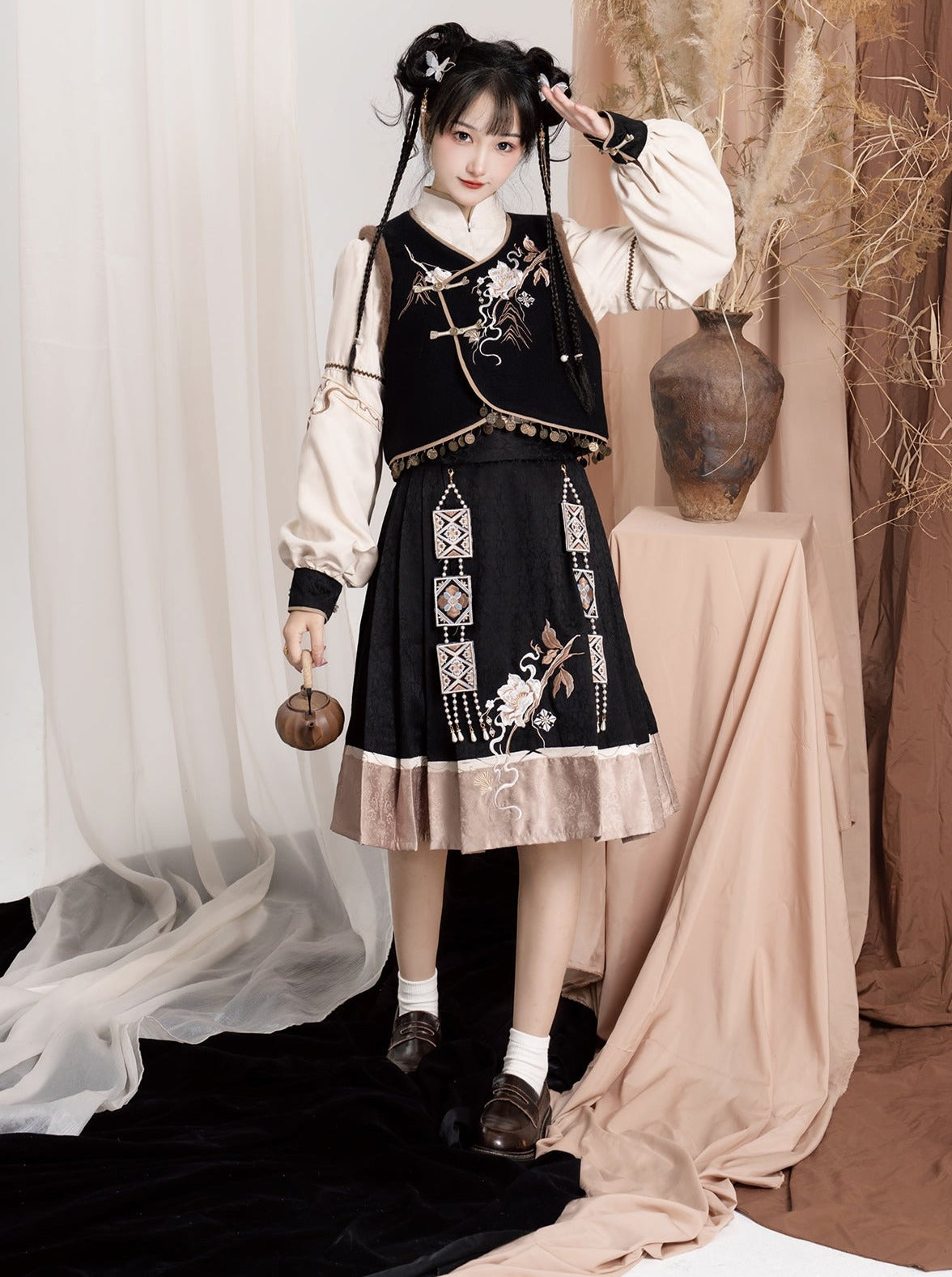 エキゾチックプラスブラウスベストフラワースリーブバッグショルダーバルーンフレアスカート