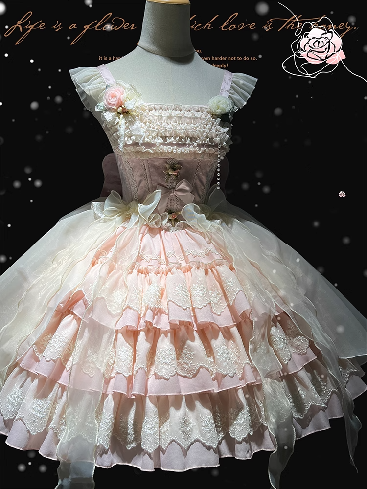 生地ジャカードスカート ティアードロリータドレス ジャンパー バレエコア スイートロゼット ピンクアクセント