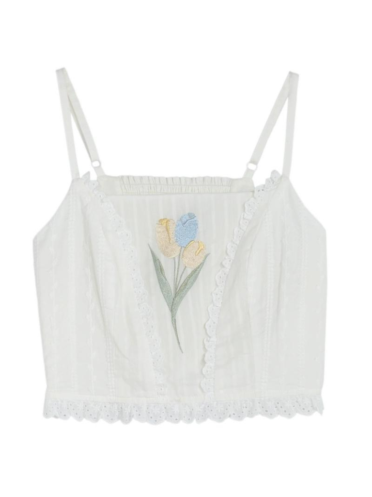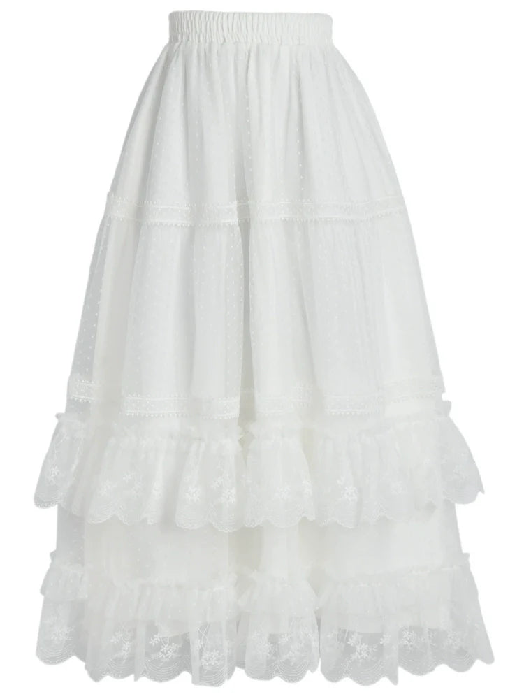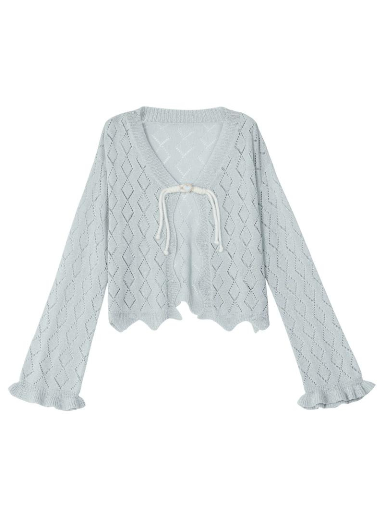 妖精のような透かし編みニットカーディガンに、キャミソールトップとロングケーキスカートを合わせた、愛らしいコーディネートです。このチャーミングなアンサンブルで、可愛く快適な着こなしをお楽しみください。