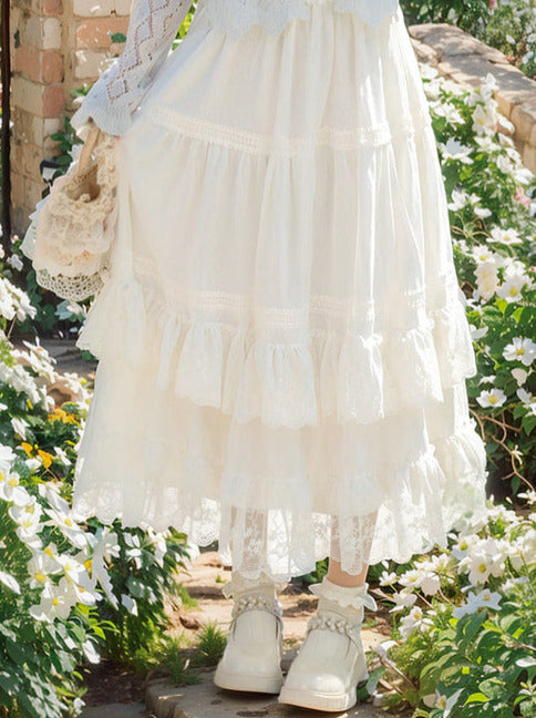 フェアリー風透かし編みニットカーディガン + キャミソールトップス + ロングケーキスカート