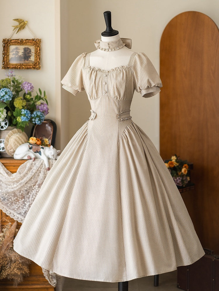 Light Khaki Striped Fabric Retro Fashion Square Neckline Puff Sleeves Vintage Dress