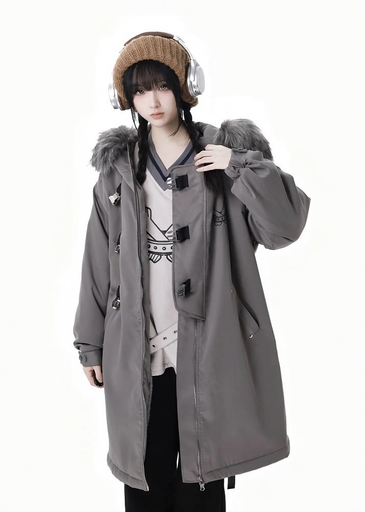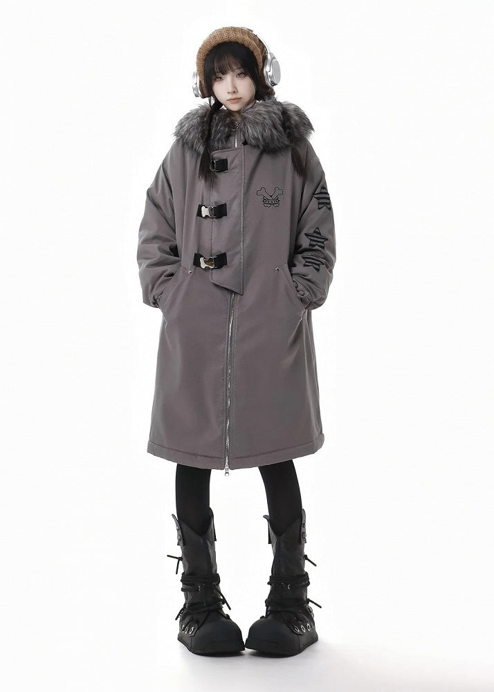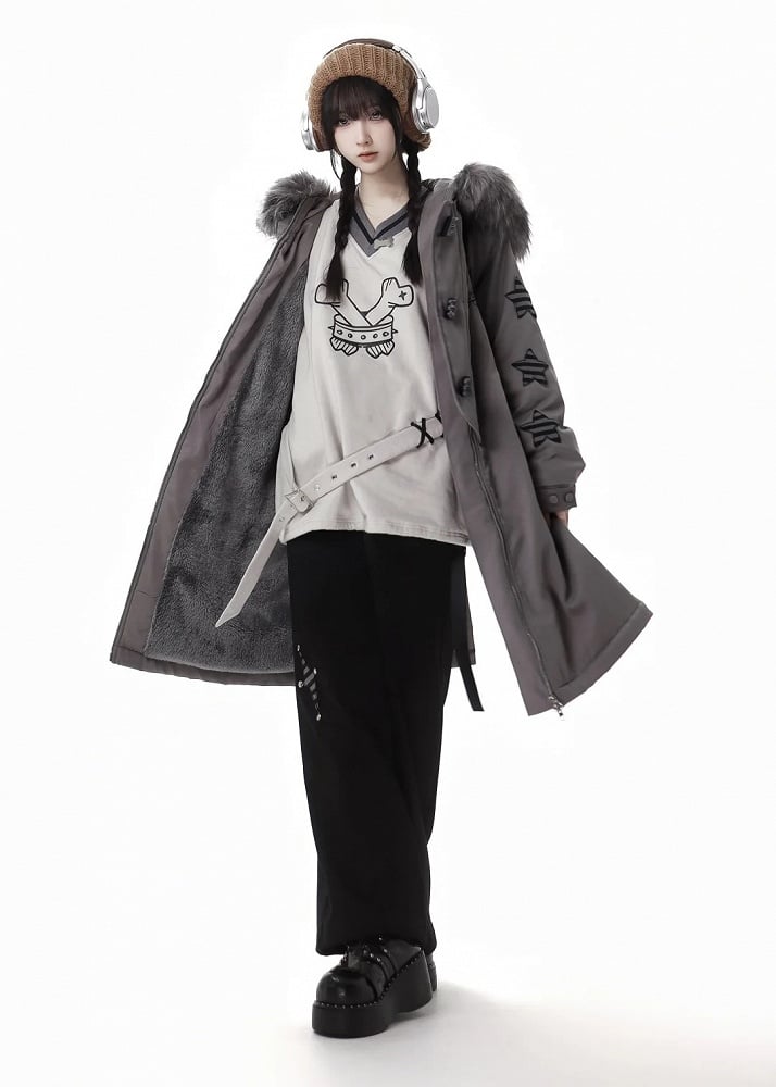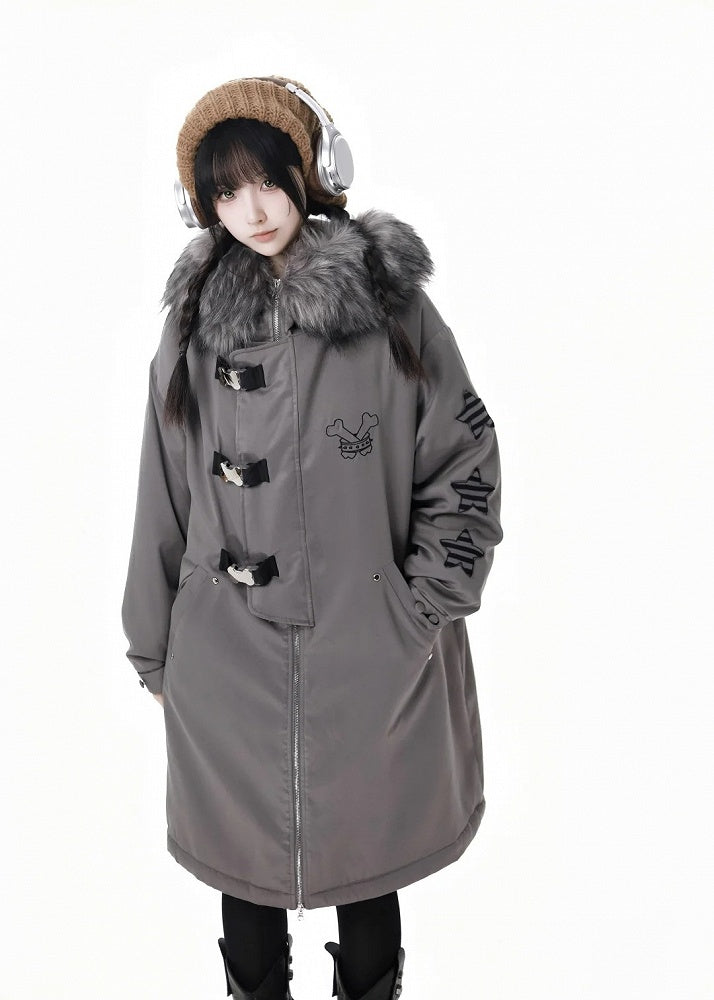 袖に星のアップリケが付いたフェイクファーカラーのグレーコート