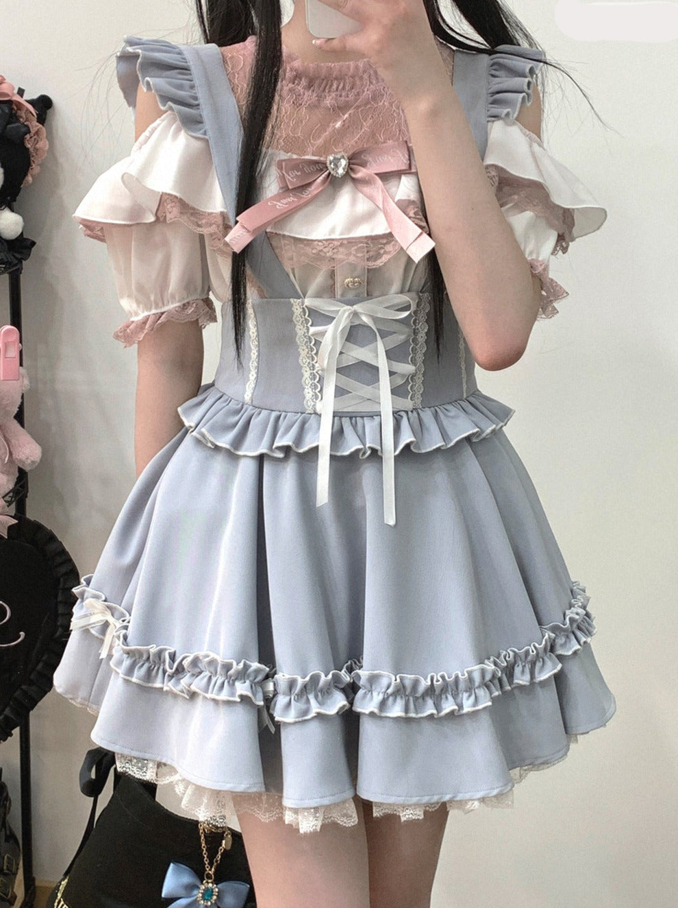青と白のオールドスクールロリータファッションドレス 蝶結びディテール JSK セット