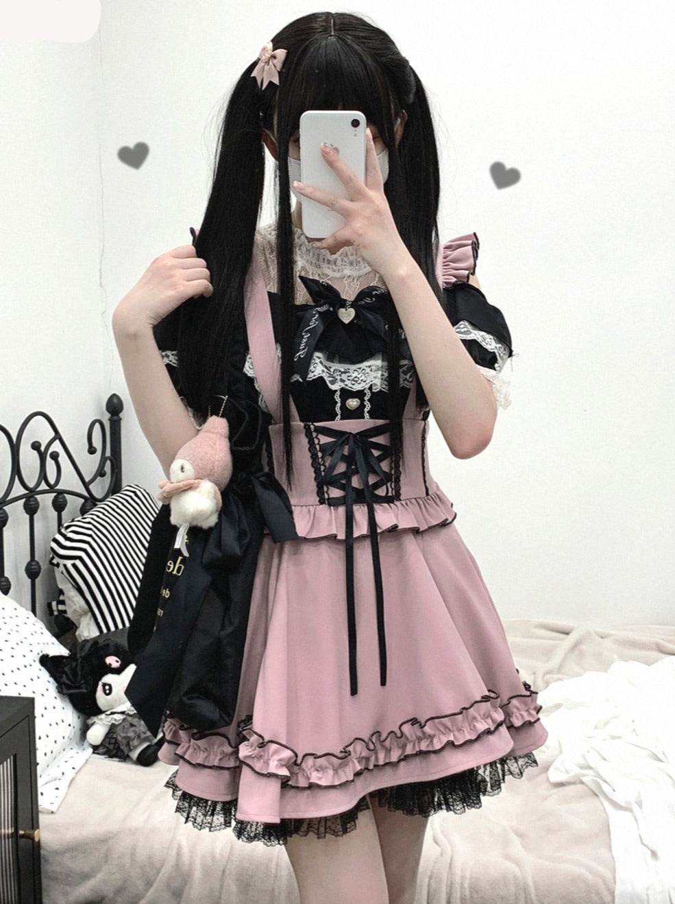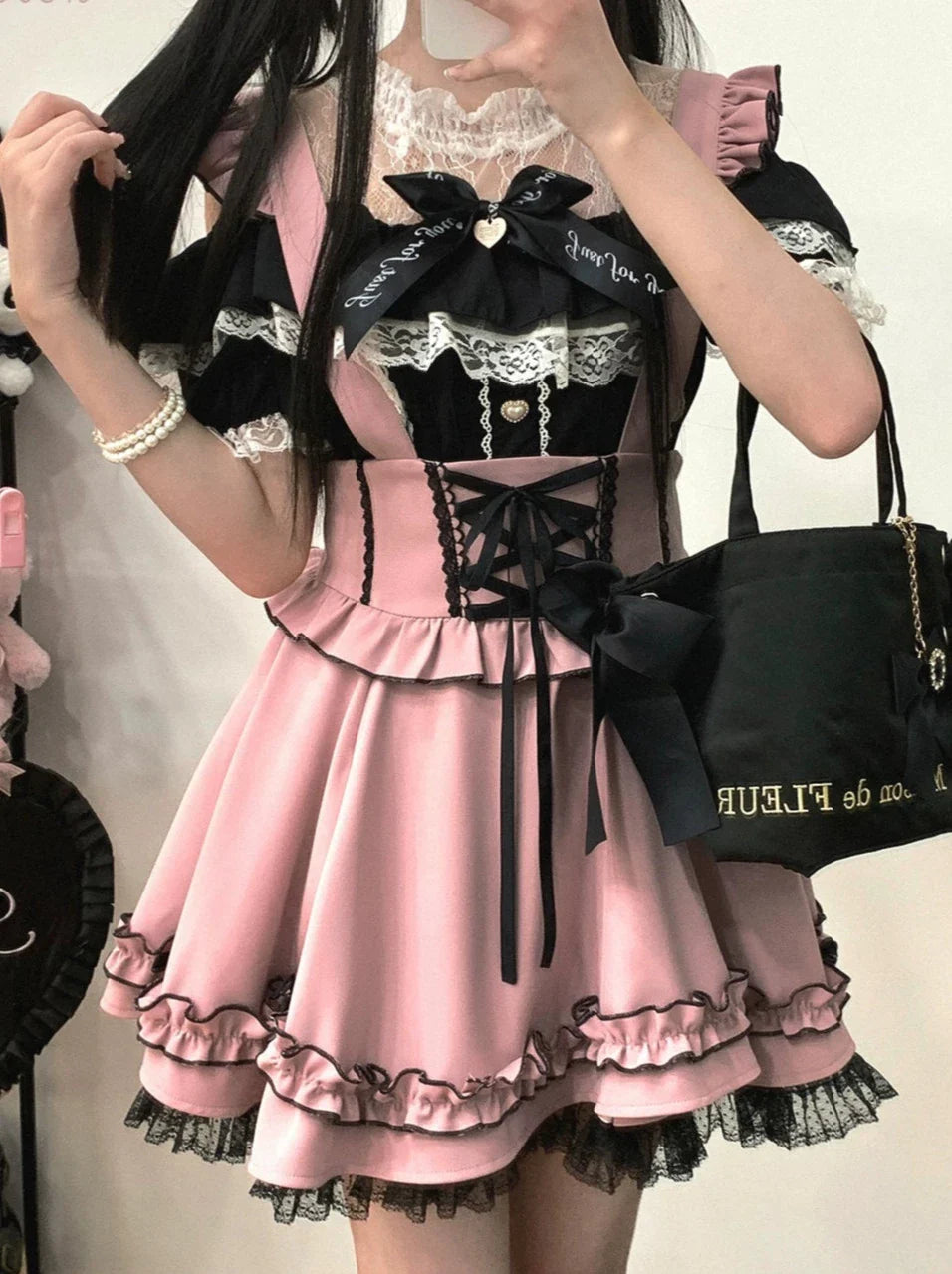 ピンクと白のオールドスクールロリータファッションドレス、蝶結びディテール、ロリータJSKセット