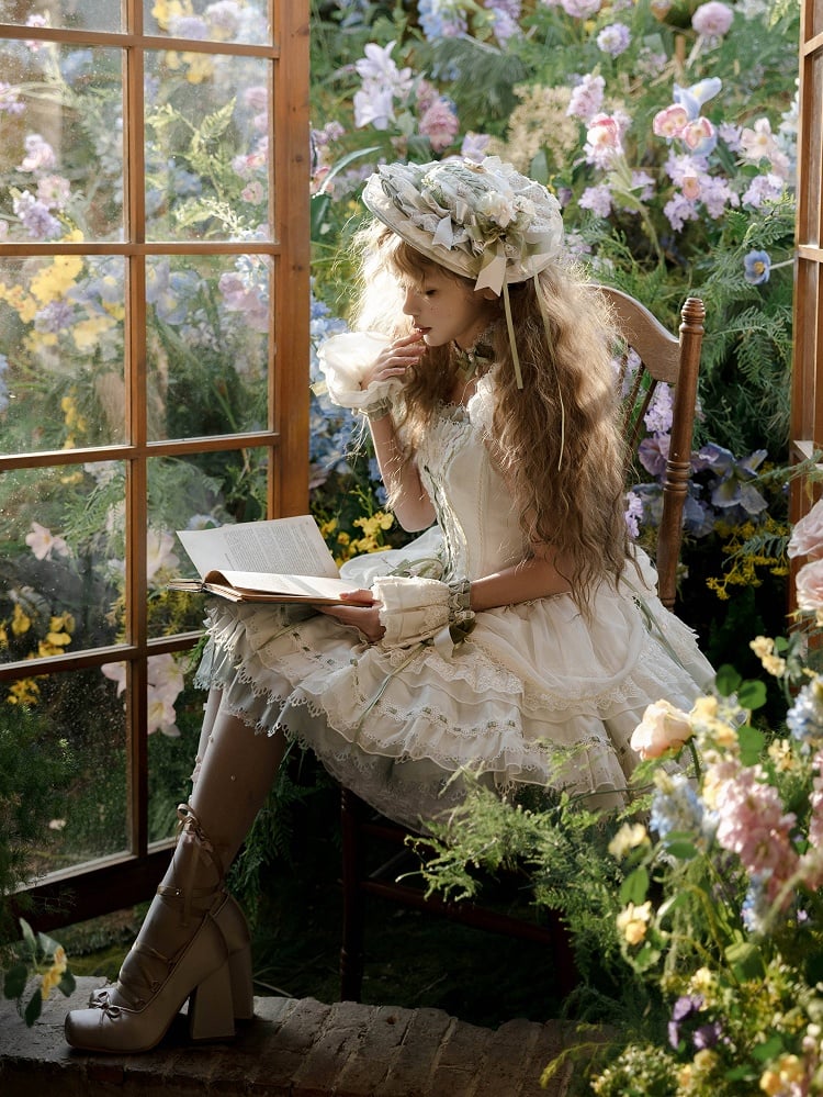 花柄と緑のリボンで飾られた帽子