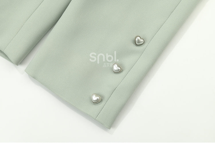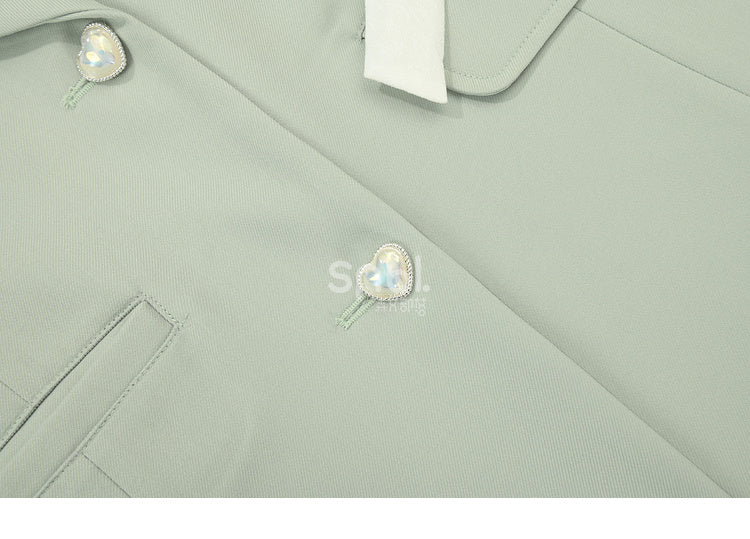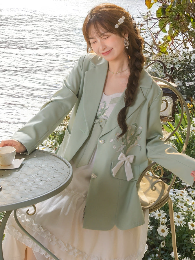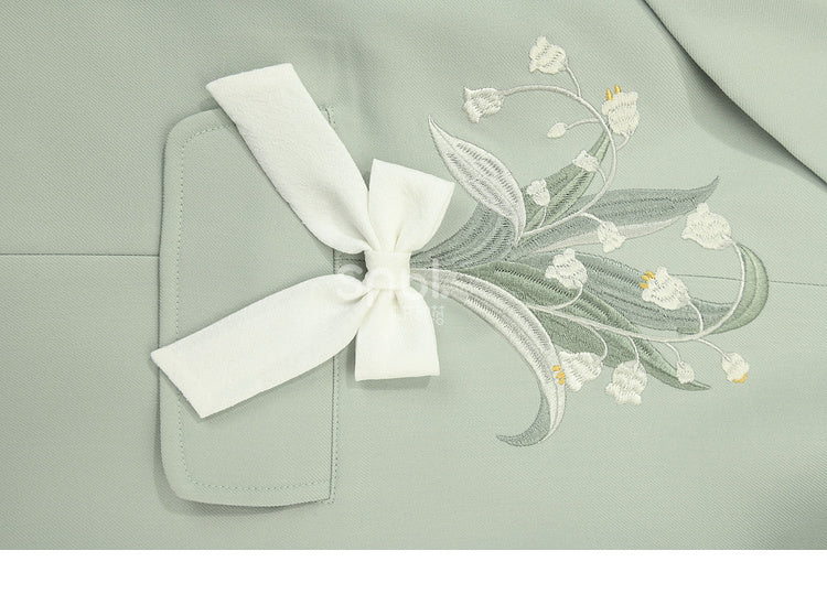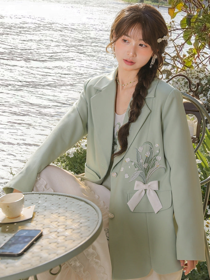 フローラル刺繍が施されたグリーンのブレザーは、個性的なハート型のボタンと繊細な花の刺繍が特徴で、装いに可愛らしさを添えます。どんなシーンにもぴったりのこのブレザーで、スタイリッシュで魅力的な装いを演出しましょう。