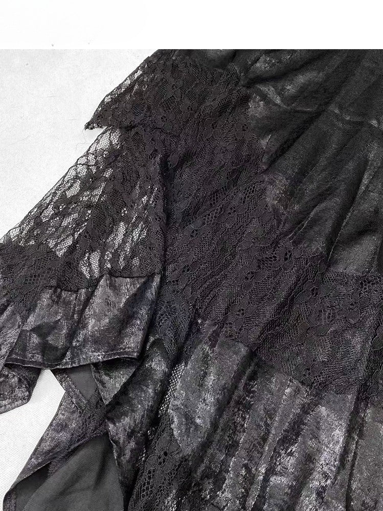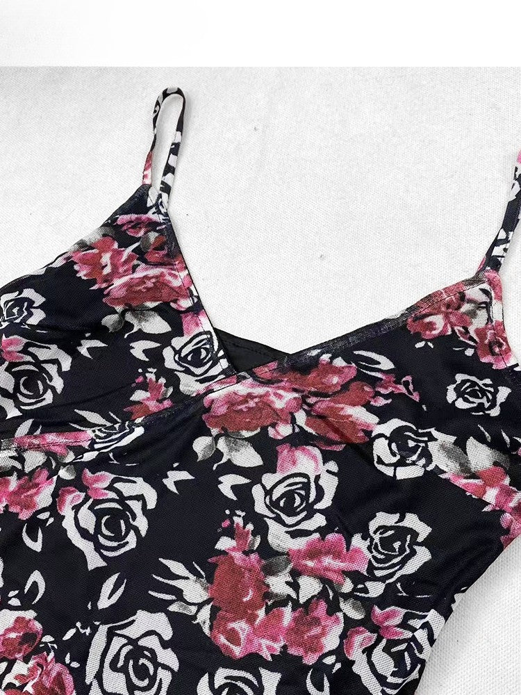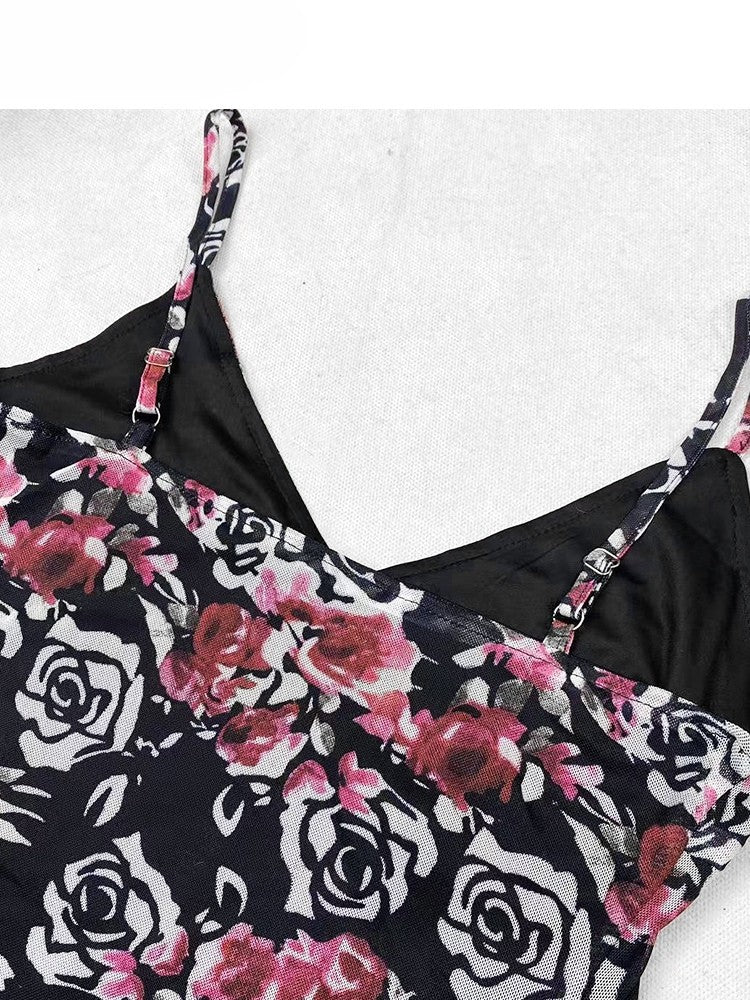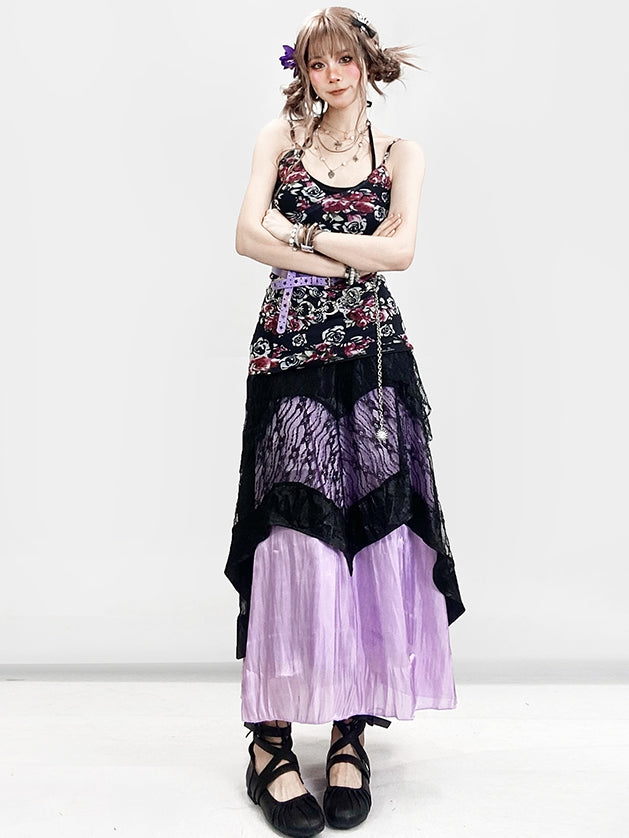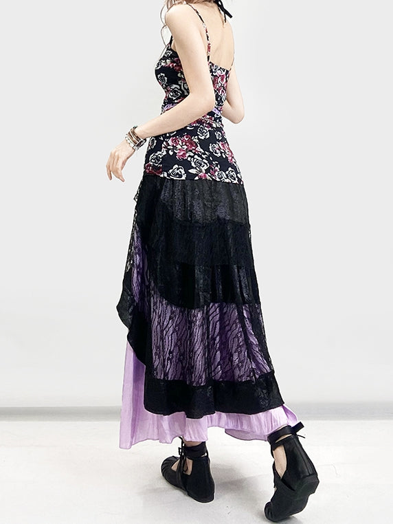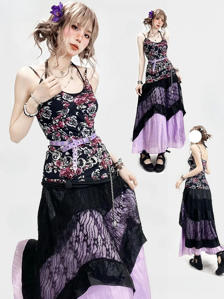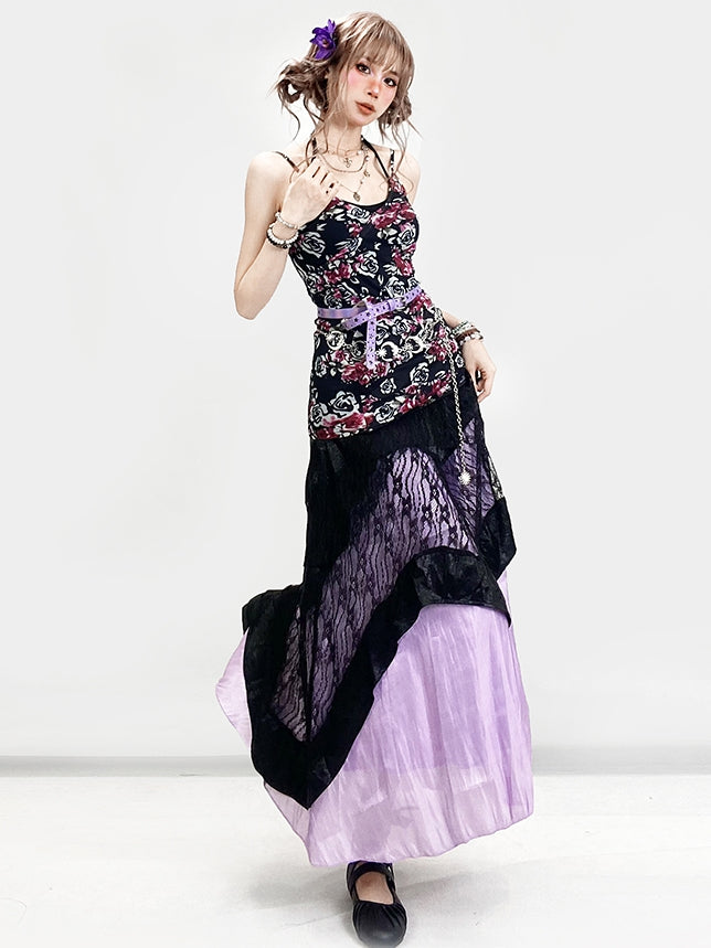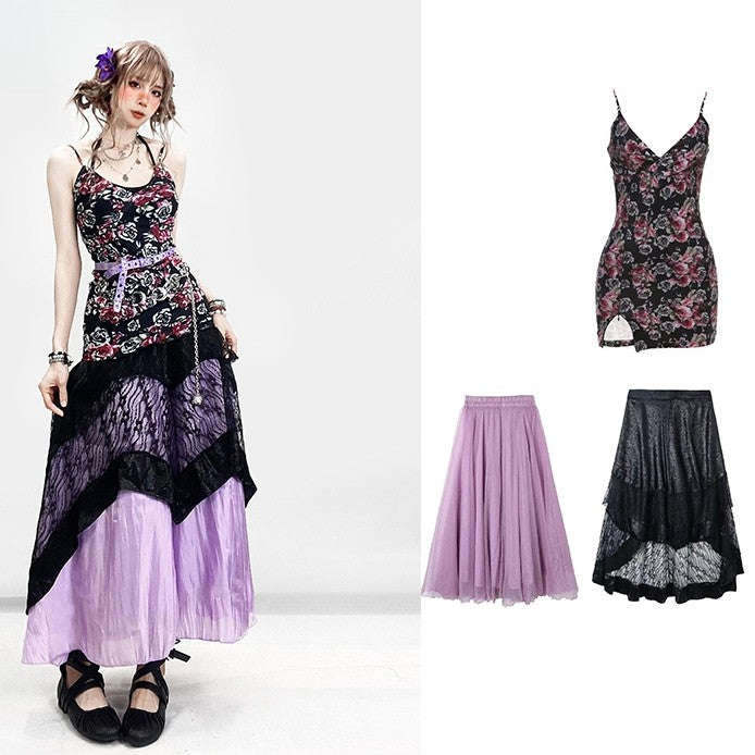 ホリデー ビタースイート セット - ブラック フローラル キャミワンピース + ホルターネック トップ + パープル アンダースカート + ブラック レース スカート