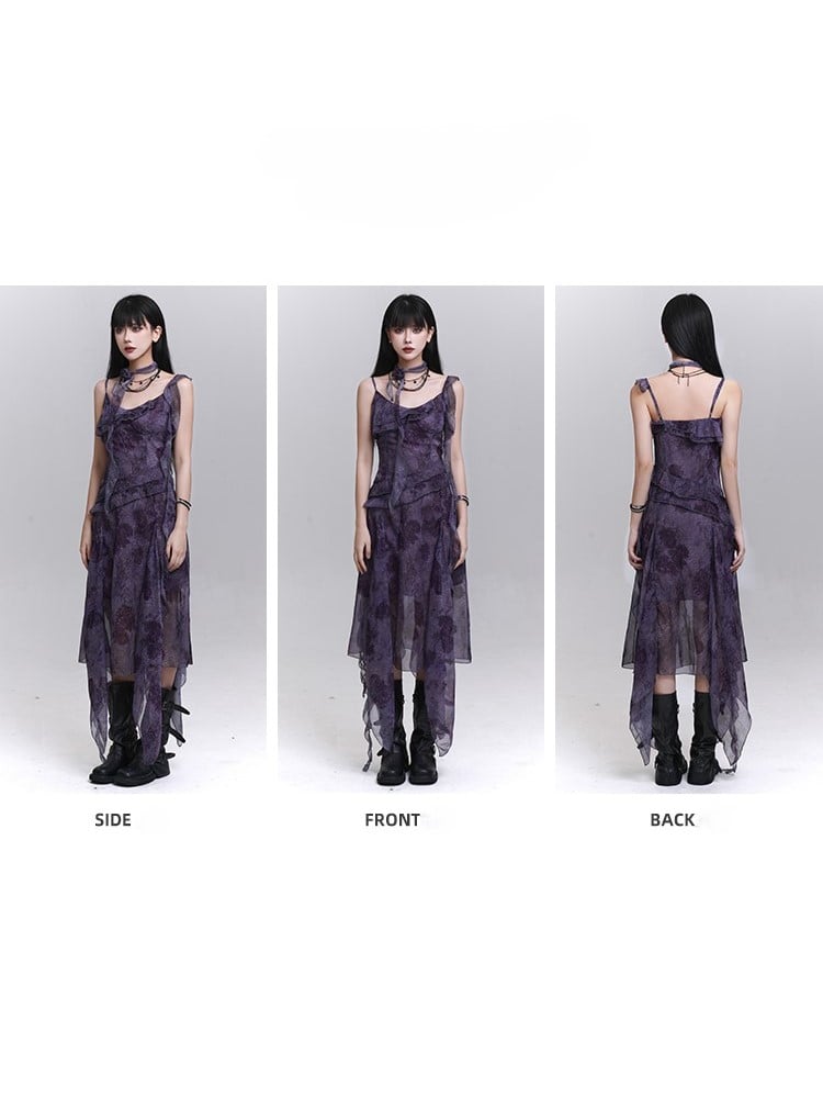Gothic Purple Tie-Dye Handkerchief Hem Slip Dress with Flowing Ribbons & Matching Neck Strap