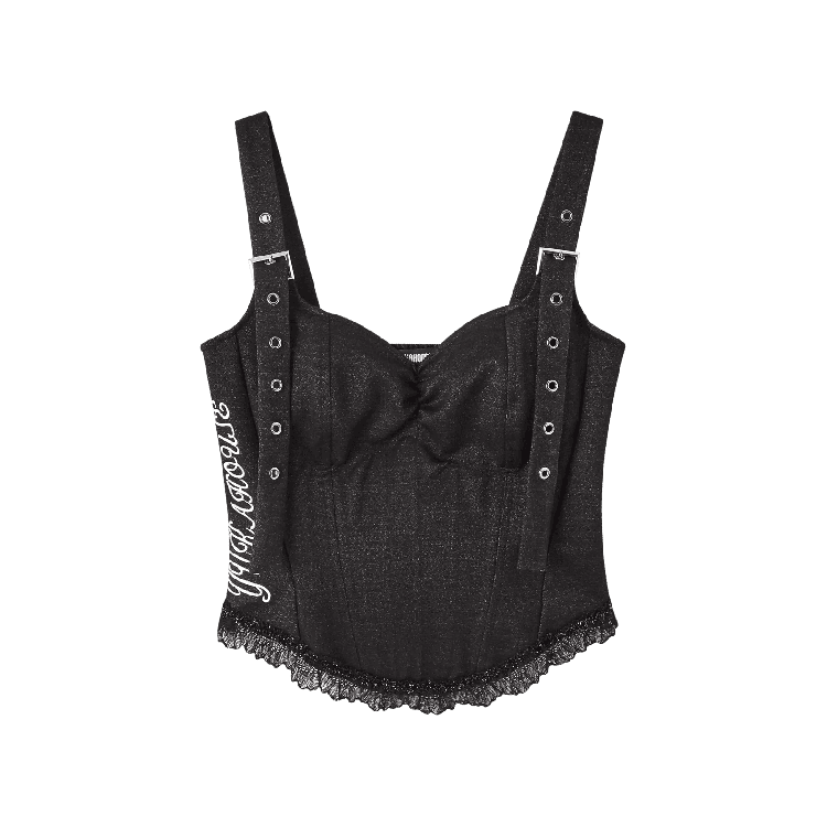 ブラックのスウィートハートネックライン、バックルショルダーストラップ、グラマラスなノースリーブコルセットトップ