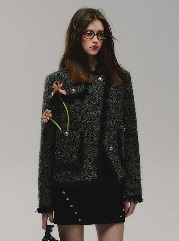 このゴールドグランドジャケットを着て、注目の的になりましょう!小ぶりなサイズ感とツイード調の色合いが、コーディネートにキュートなアクセントを添えます。上質な素材で、暖かくスタイリッシュに過ごせます。