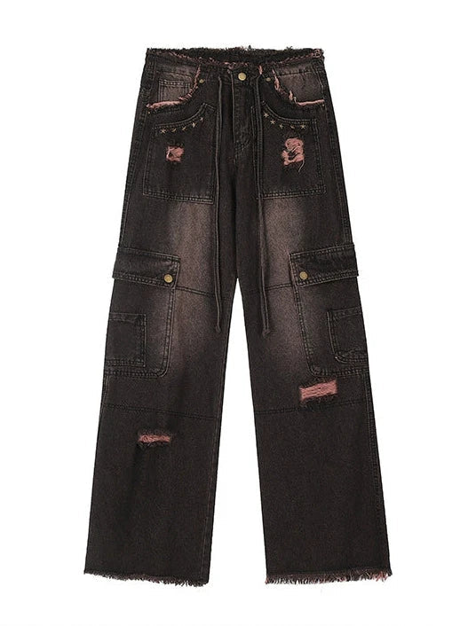 グラデーション レトロ カーゴデニム ダメージ ブラックパンツ