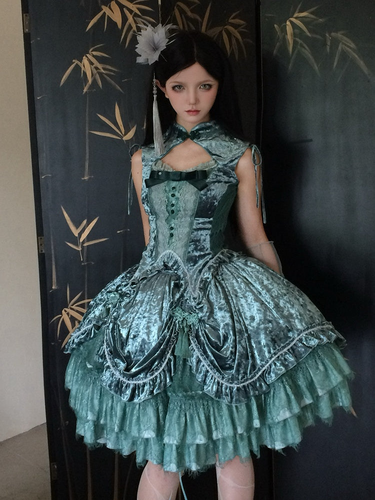 青と白のオールドスクールロリータファッションドレス 蝶結びディテール JSK セット