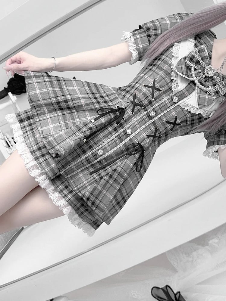グレーのレースアップディテール、ウエストラインストーン装飾のミニドレス+ショーツ、ジライケイチェック柄セット