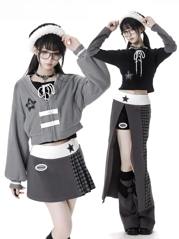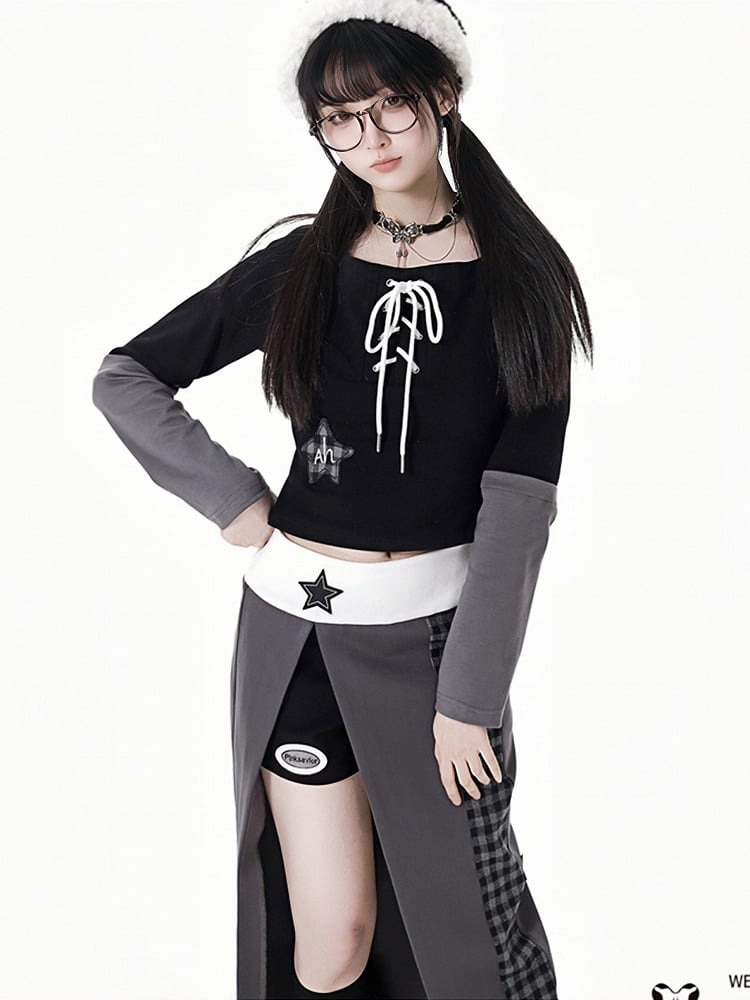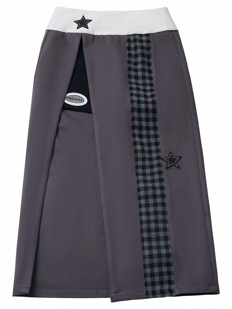 グレーパープルのスターアップリケ付き太もも丈スリット入りチェック柄ロングスカート