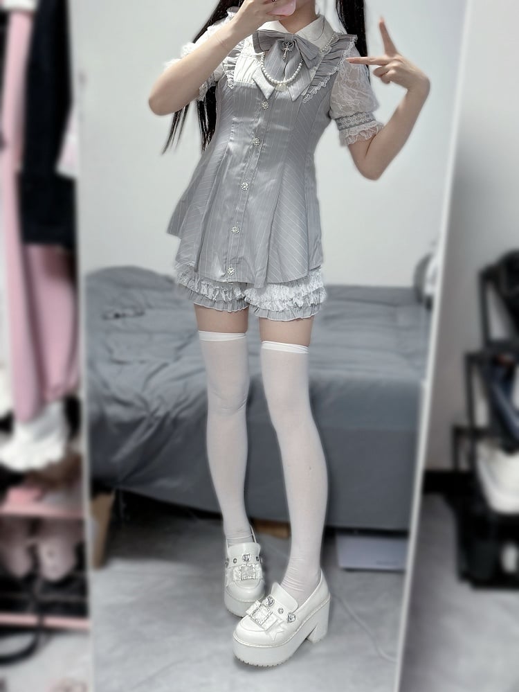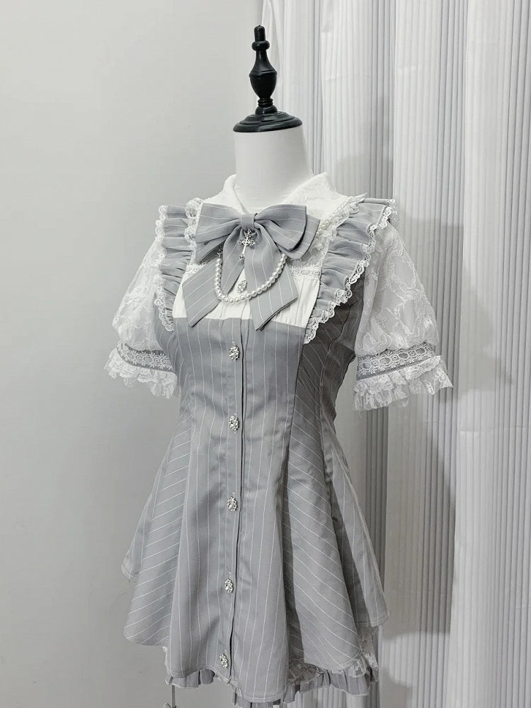 グレーストライプのジライケイセット - イリュージョンネックラインのレースアップバックミニドレス + ショートパンツ + 蝶ネクタイ