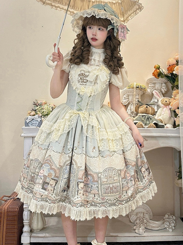 グリーン/ベージュのボーンウエストテディスイートロリータジャンパースカート