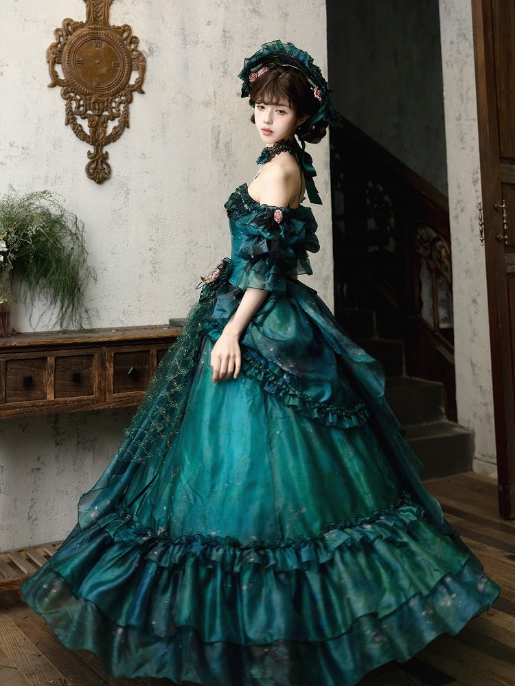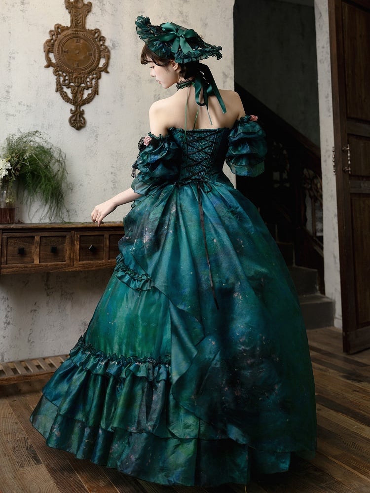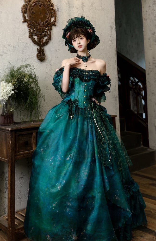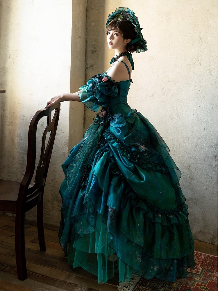 グリーンフォレストフェアリーロリータアシンメトリーデザイン油絵スカート、花柄ヘアクリップ付き