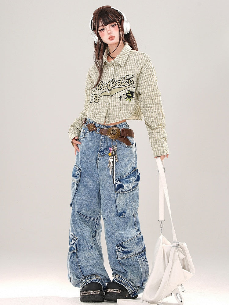 グリーン/ピンクの文字のチェック柄クロップドシャツ