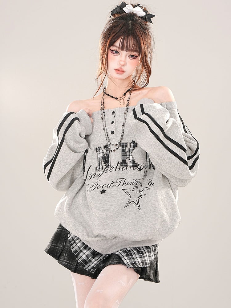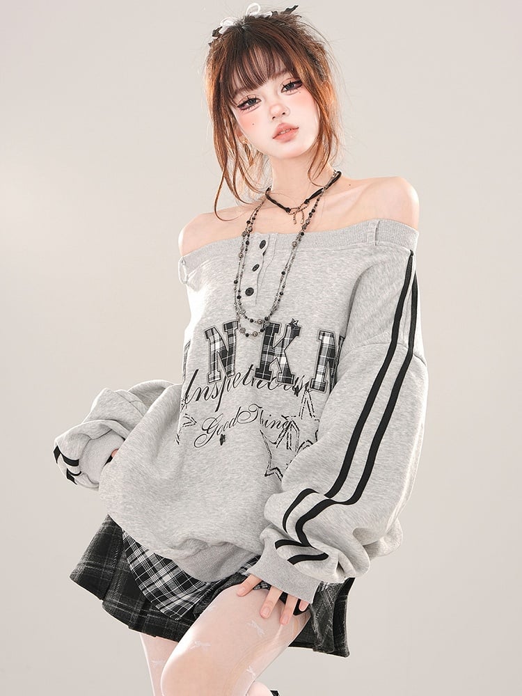 グレーレターパッチ刺繍オフショルダーネックラインスウェットシャツ