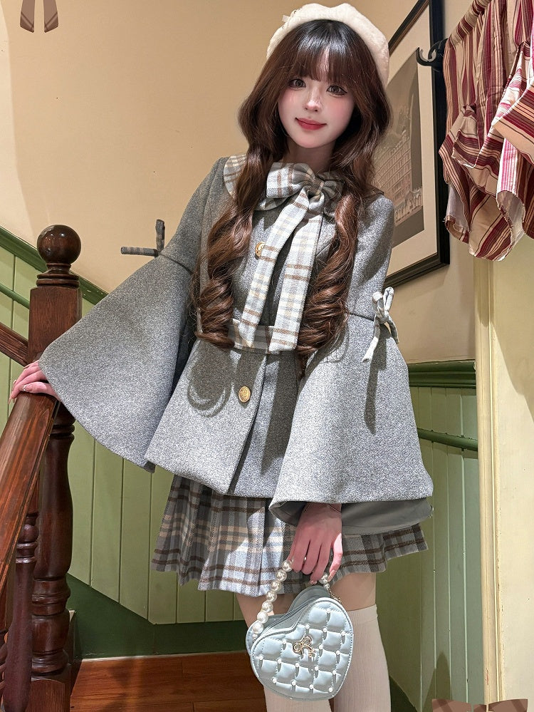 グレーのプレッピースタイルベルスリーブジャケット(チェック柄リボンアクセント付き)+グレーのチェック柄プリーツスカートセット