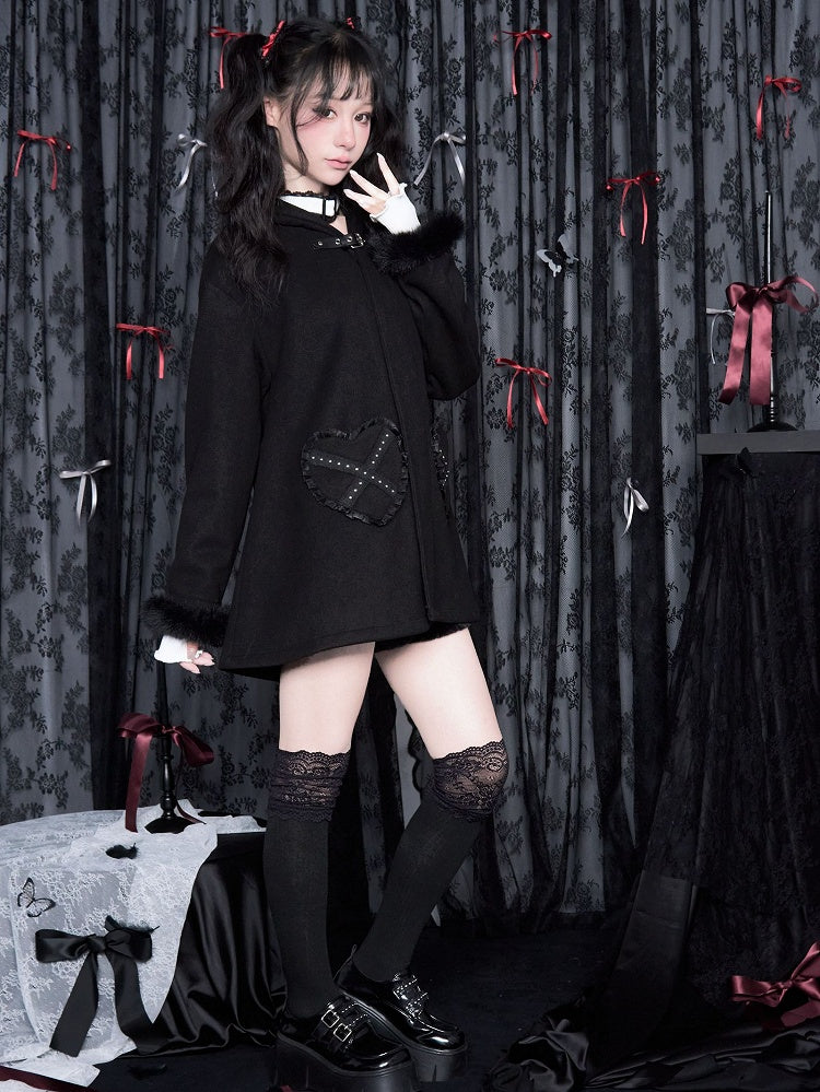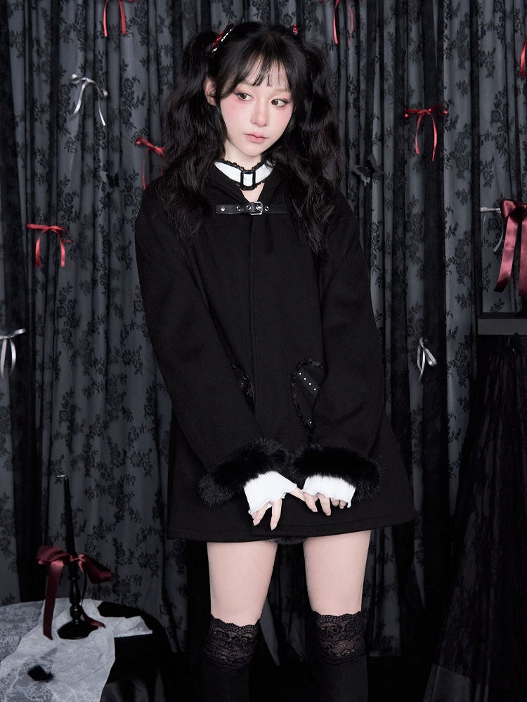 ジライケイ プラッシュ袖口 ハートアップリケポケット バックルストラップ スタッズ付き ブラックフード付きジャケット