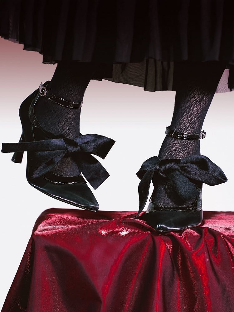 Heels Black Accent Knotted Toe Pointed High Bow Gothic with
