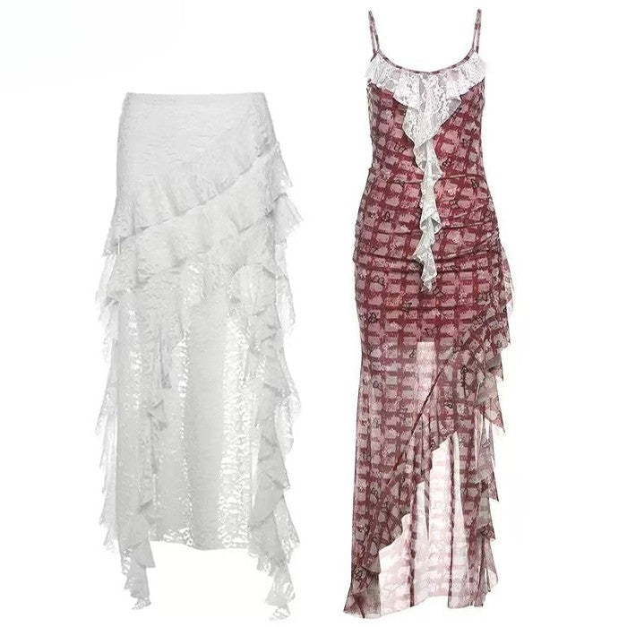 ほろ苦いグラマラスセット - 赤い蝶のチェック柄アシンメトリーヘムキャミワンピース + ホワイトレーススカート
