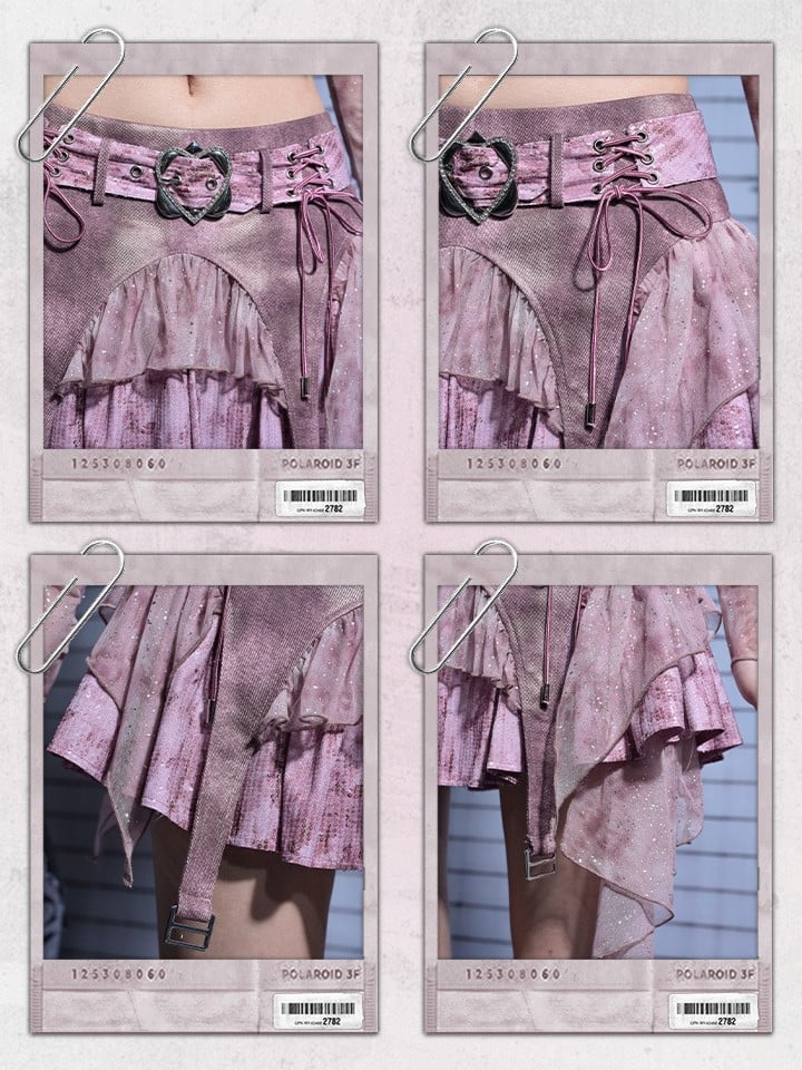 Hem Mini Pink Skirt Denim Belt Asymmetric Sequined Heart with Y2K Buckle Punk