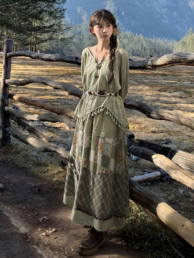 ボヘミアングリーンVネックタッセルヘムトップス(ベルト付き)