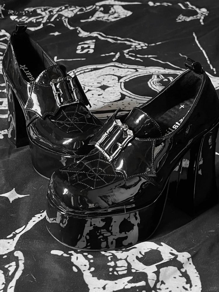 Polished Black Gothic Platform High Block Heels in PU Leather - Bat Wing Decor & Spiderweb Design
