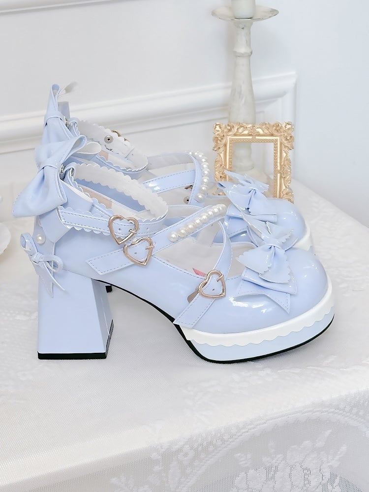 Blue Platform High Block Heels in Sweet Lolita Style with Crisscross Design & Bow Details