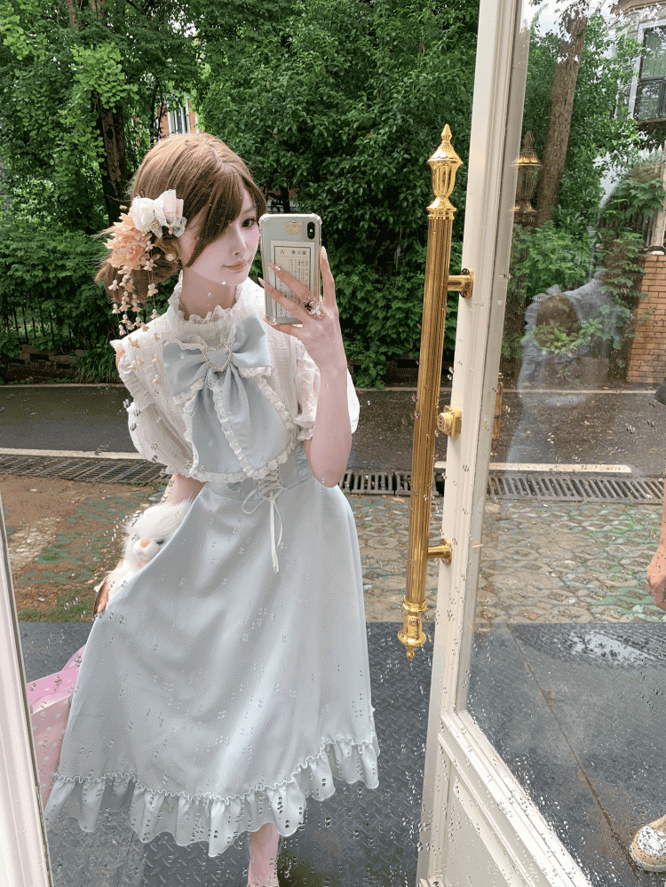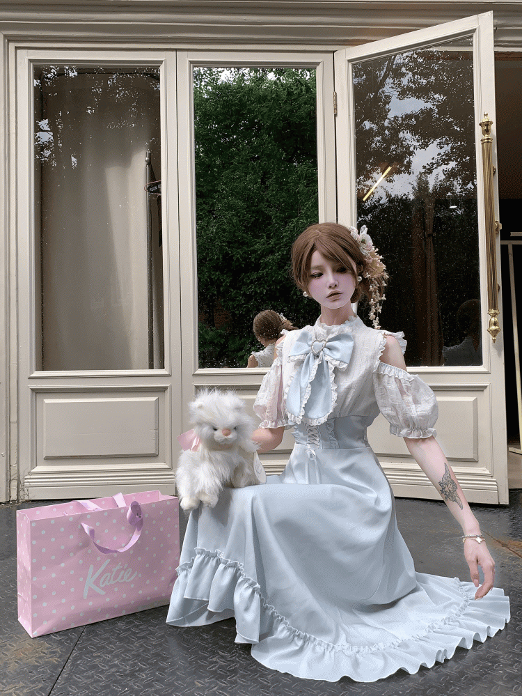 青と白のオールドスクールロリータファッションドレス 蝶結びディテール JSK セット