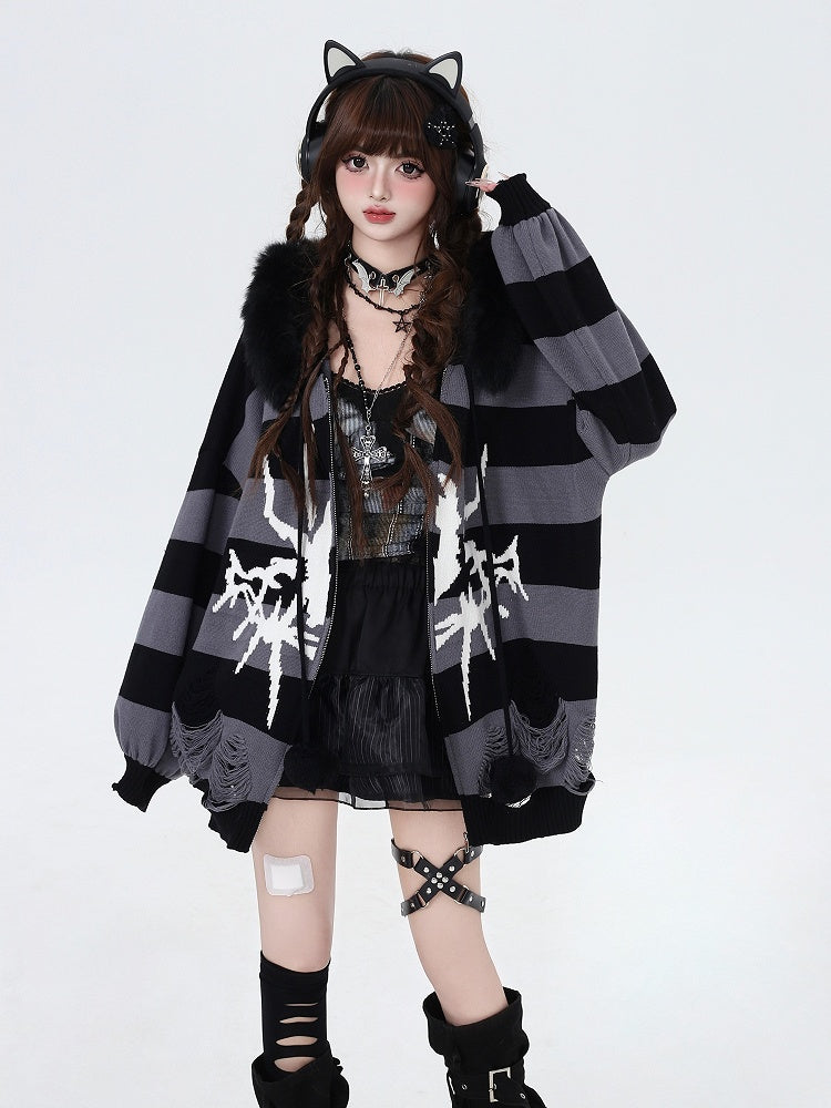 Punk Black & Gray Striped Hooded Zip Sweater with Detachable Faux Fur Trim