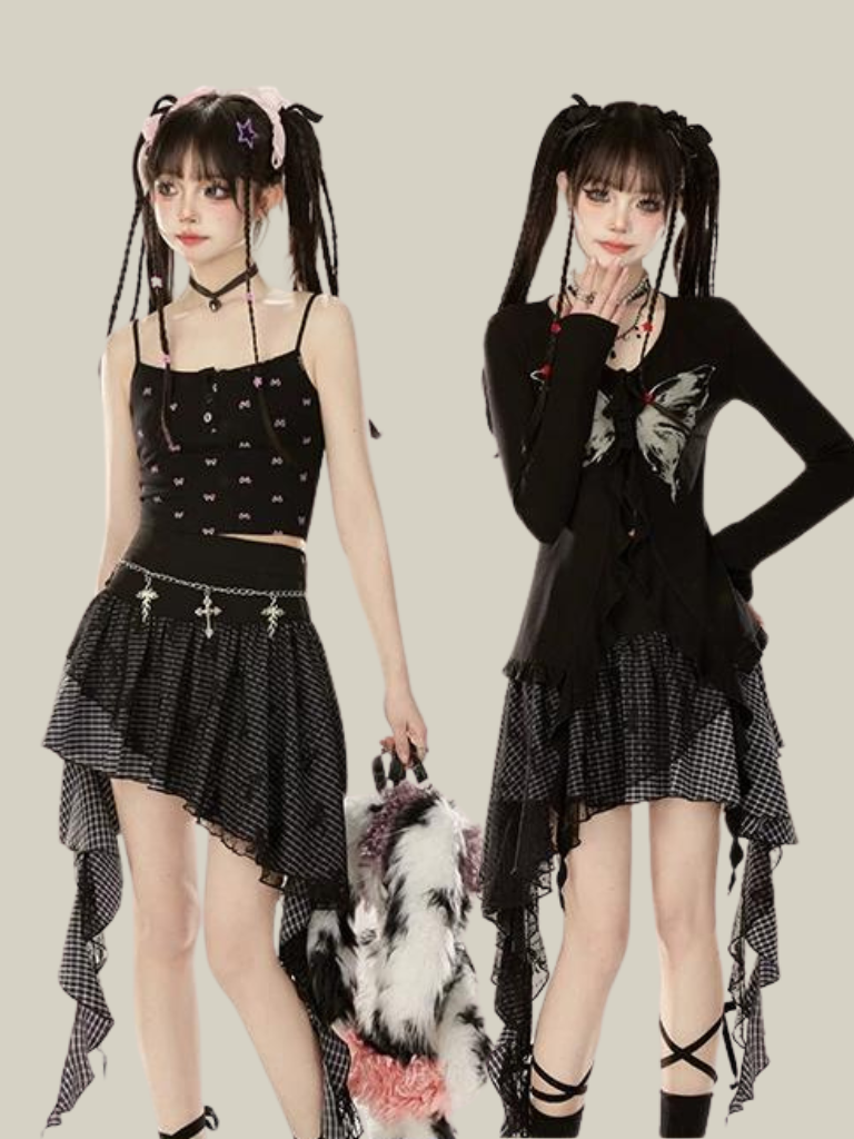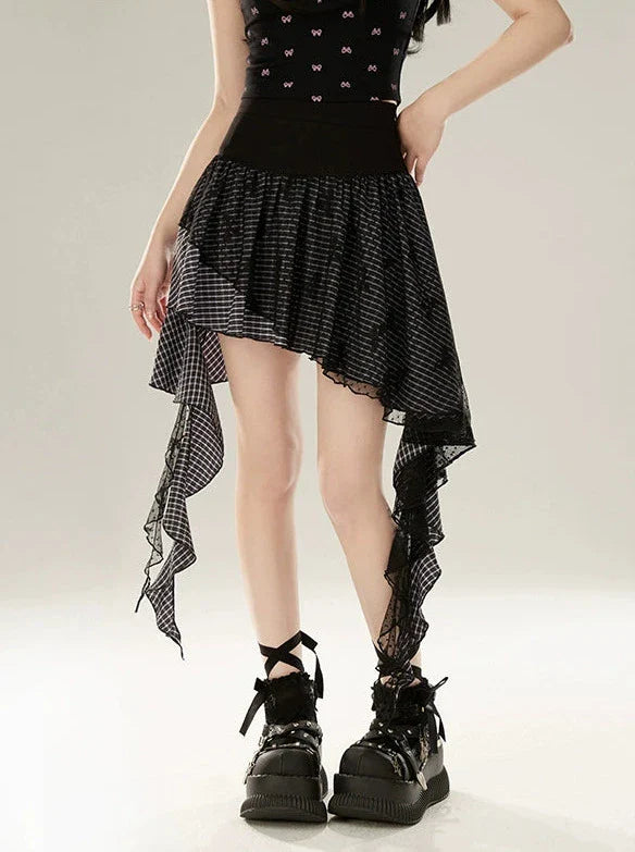 ユニークなチェック柄と繊細なフリルのディテールが特徴のレーススカートは、どんな装いにも華やかさを添えてくれます。軽やかなメッシュ素材で仕立てられており、どんなシーンにも合わせやすい、可愛らしく快適な一枚です。