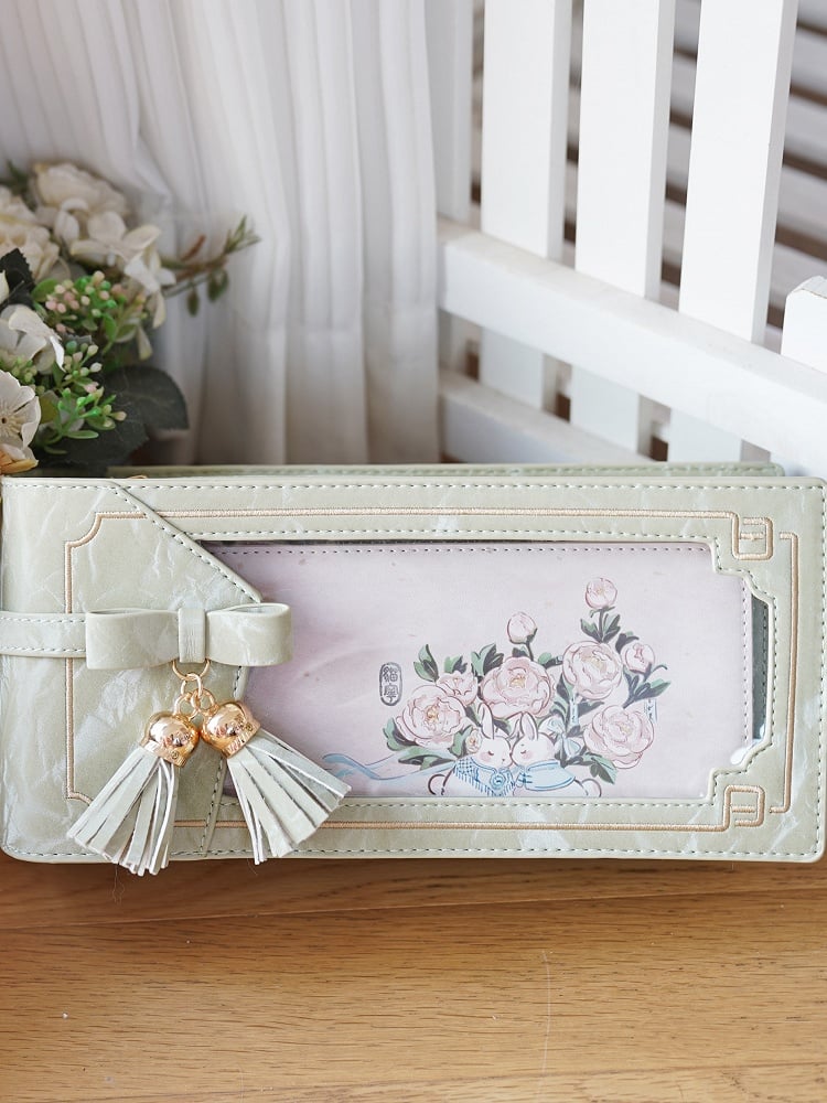 グリーンのPU花柄チャイナドレス風イタバッグ(リボン&フリンジアクセント付き)