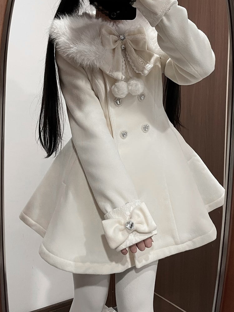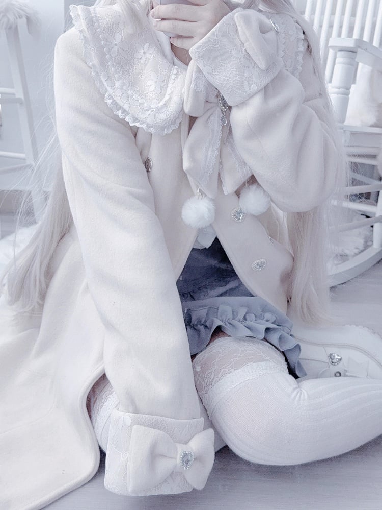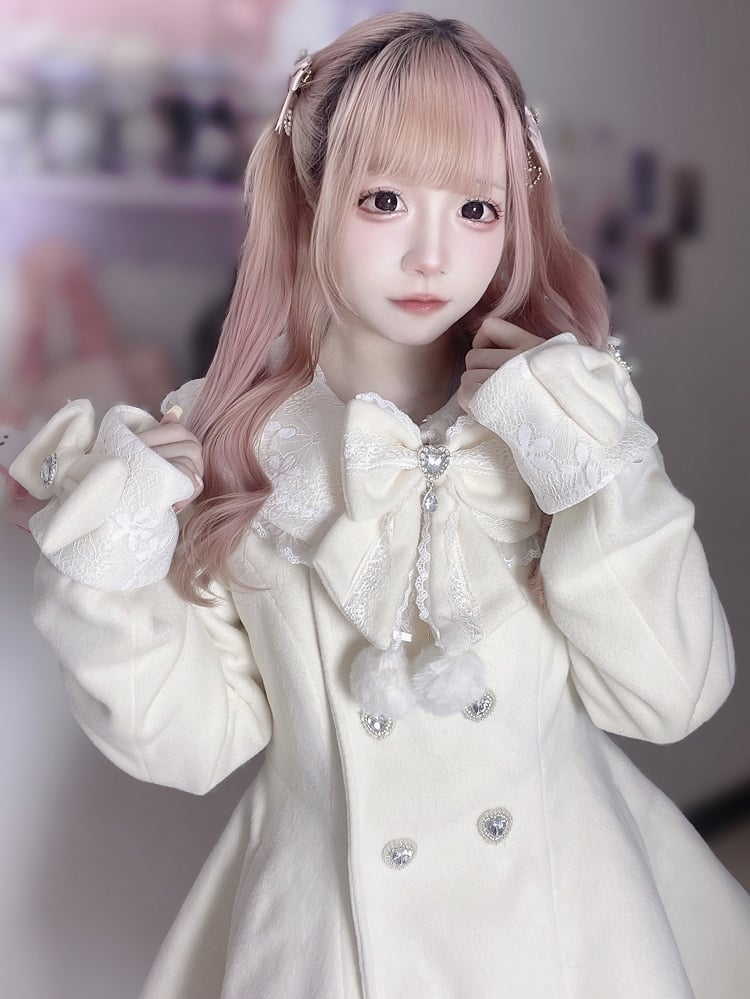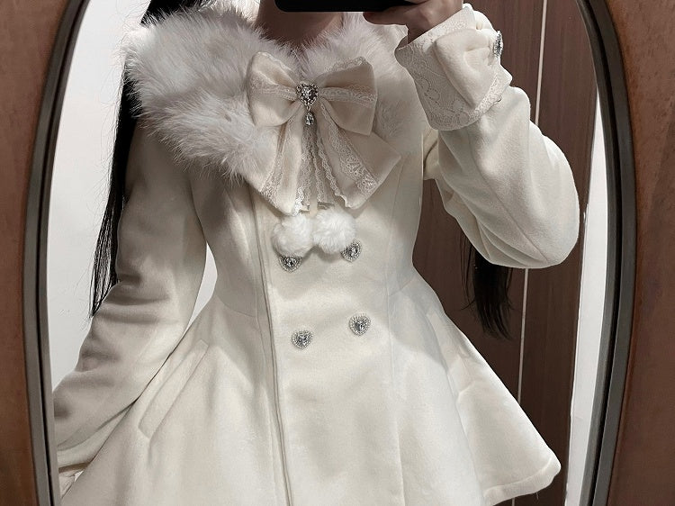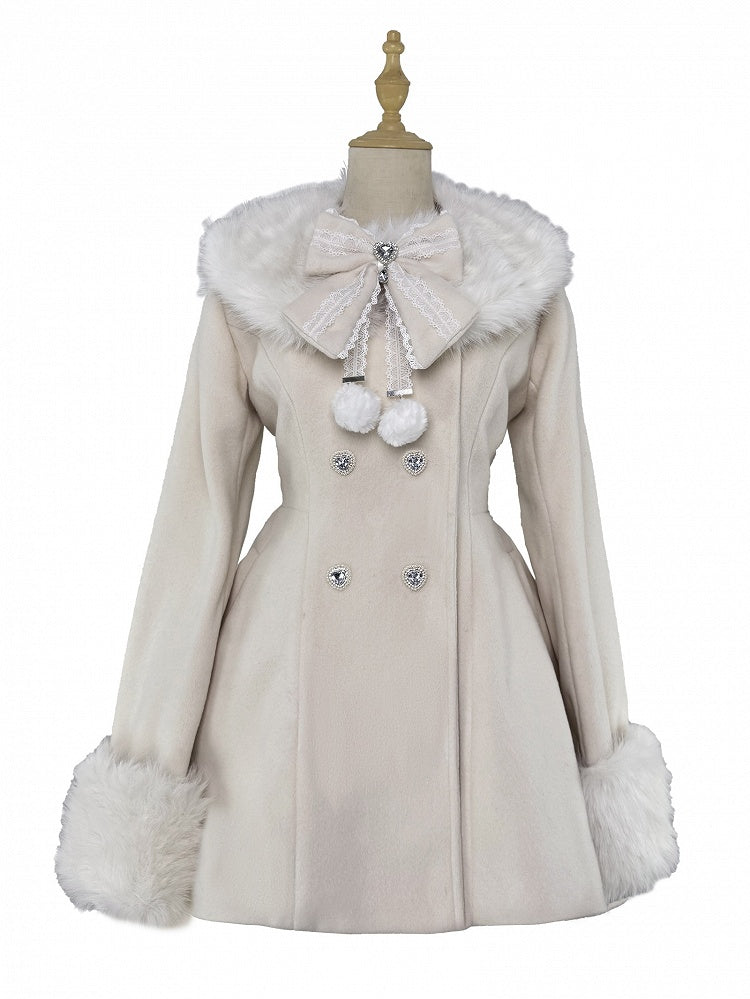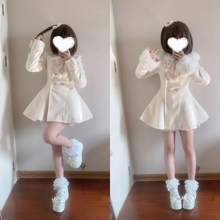 ジライケイ ベージュ 取り外し可能なプラッシュカラーとカフス 地雷風 リボン付きウールコート