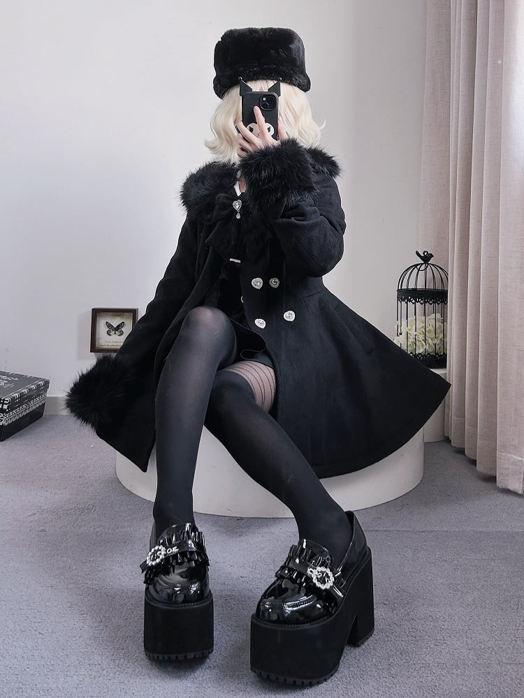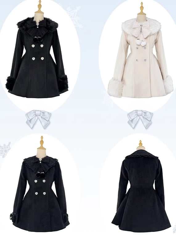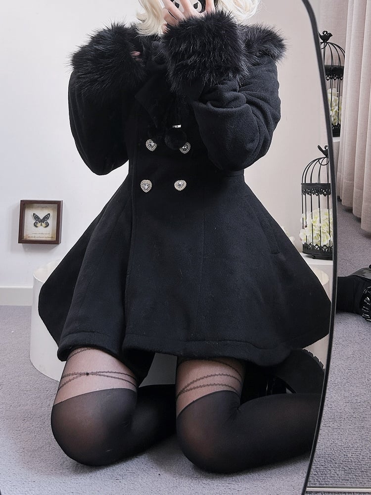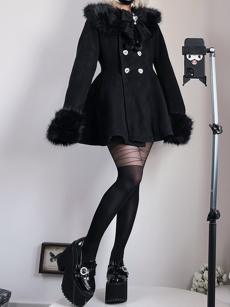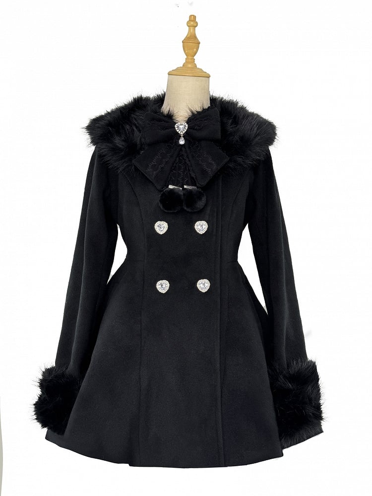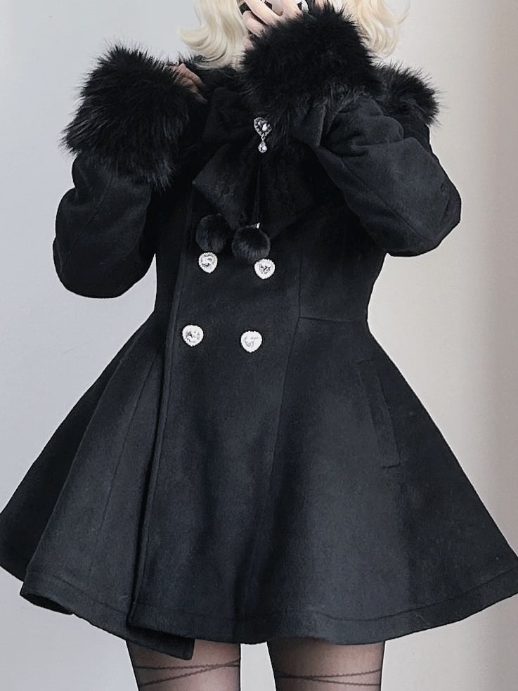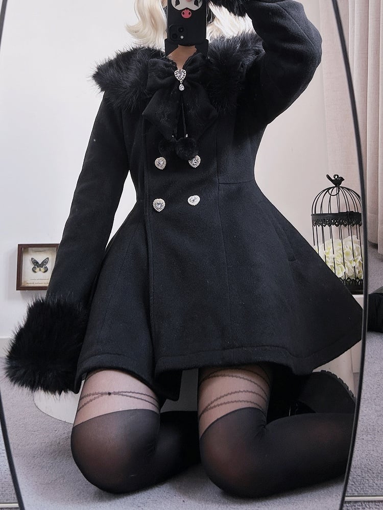 ジライケイ ブラック 取り外し可能なプラッシュカラーとカフス 地雷風 リボン付きウールコート