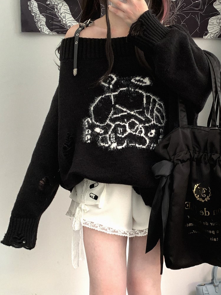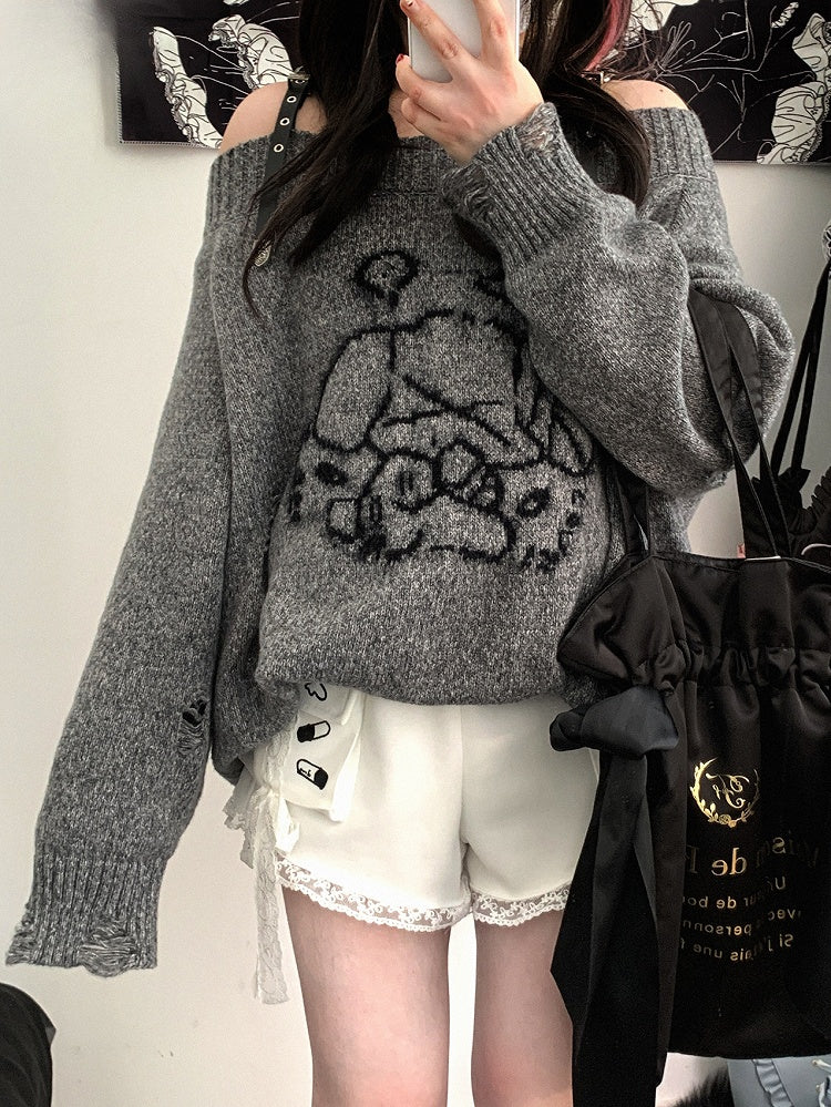 ジライケイ グレーエンジェル パピー グラフィック ダメージ加工 ホールズ ランドマイン ルーズ セーター