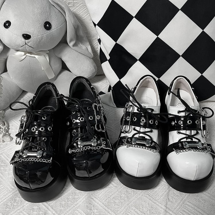 Jirai KeiのポリッシュドブラックY2Kボーンバックルストラッププラットフォームシューズで、スタイルをワンランクアップさせましょう。ポリッシュドブラックのデザインにボーンバックルストラップが個性的なアクセントを添え、プラットフォームが高めのヒールで自信に満ちた足取りを演出します。キュートでスタイリッシュなこのシューズで、どんな装いもワンランクアップさせましょう。