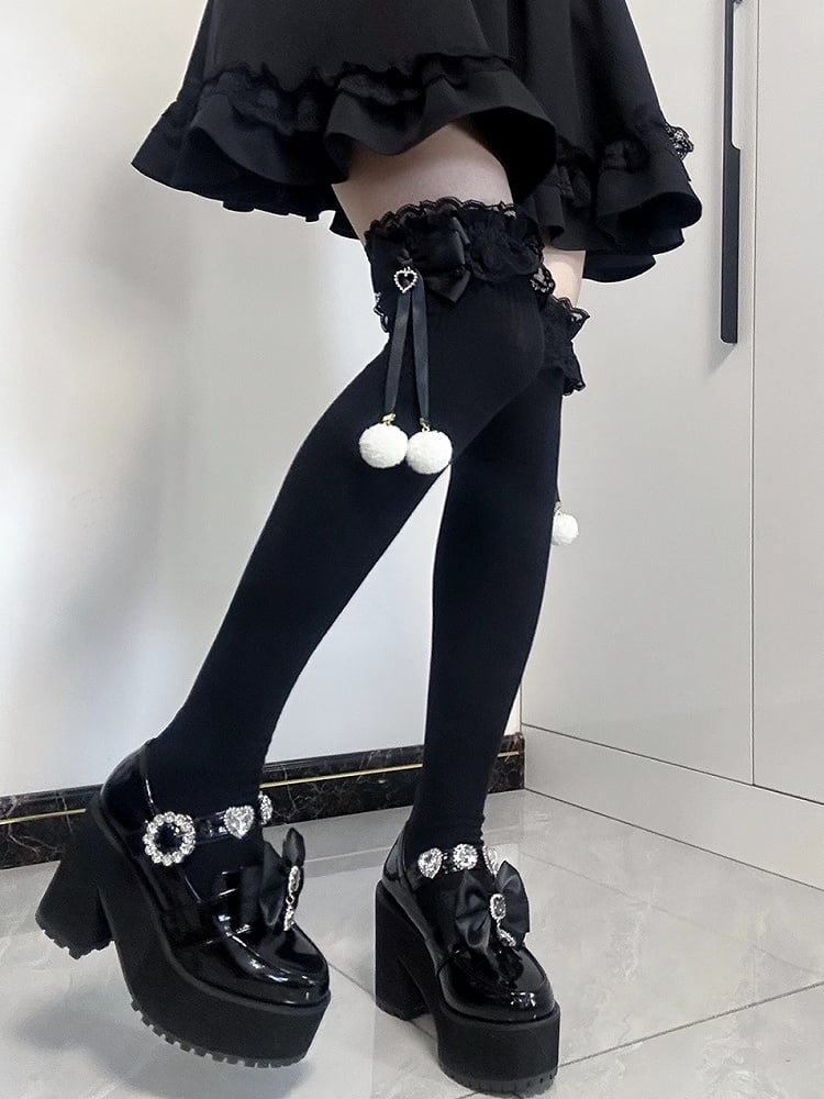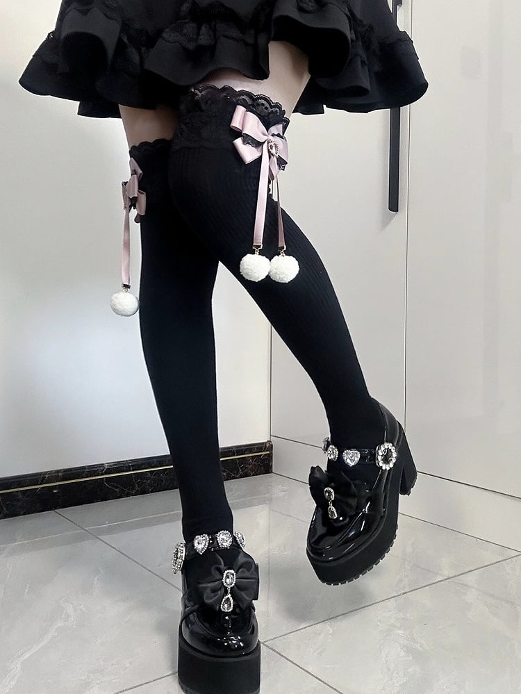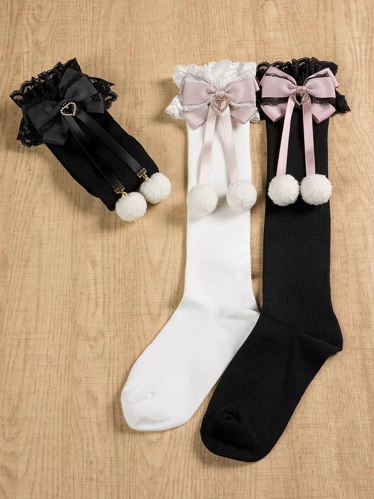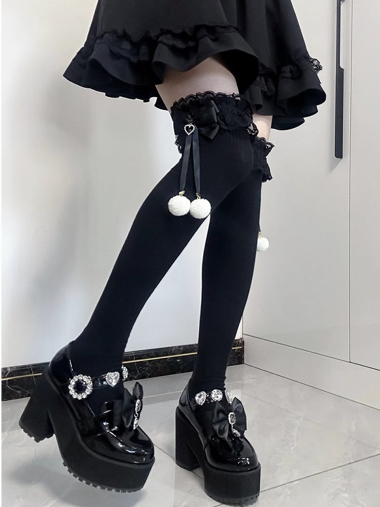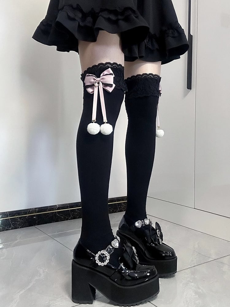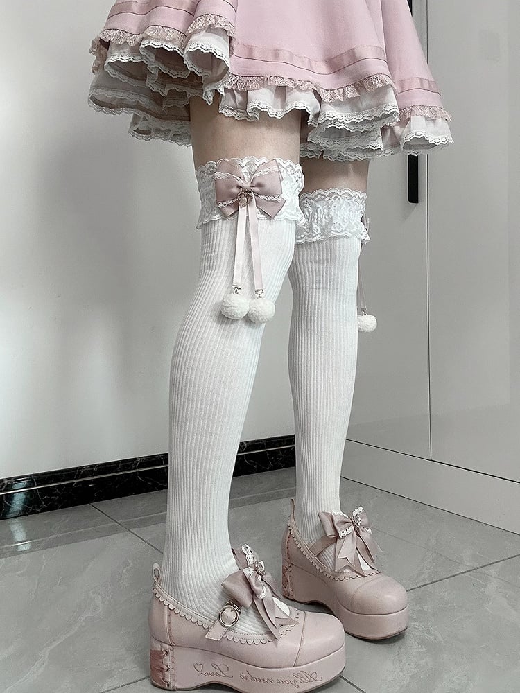 ジライケイ ポンポンディテール レースカフス 蝶結び オーバーニーストッキング