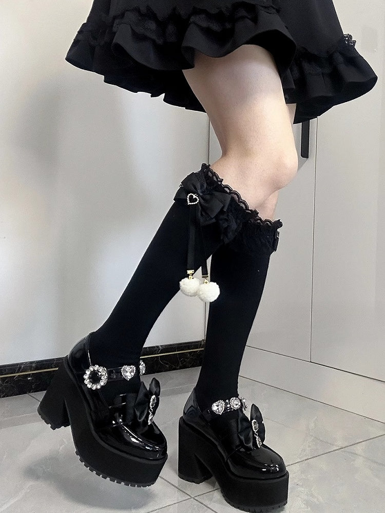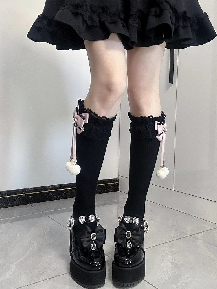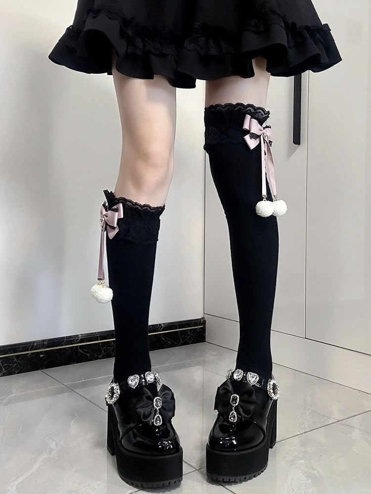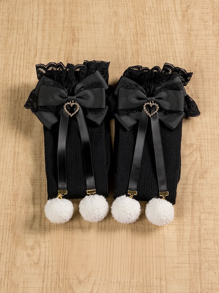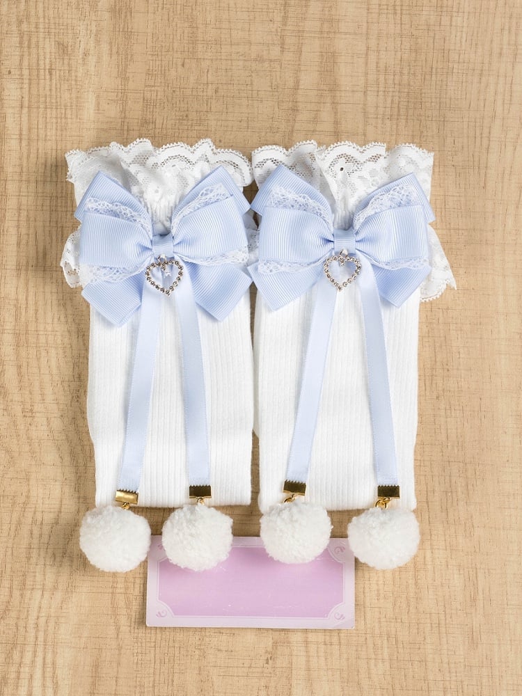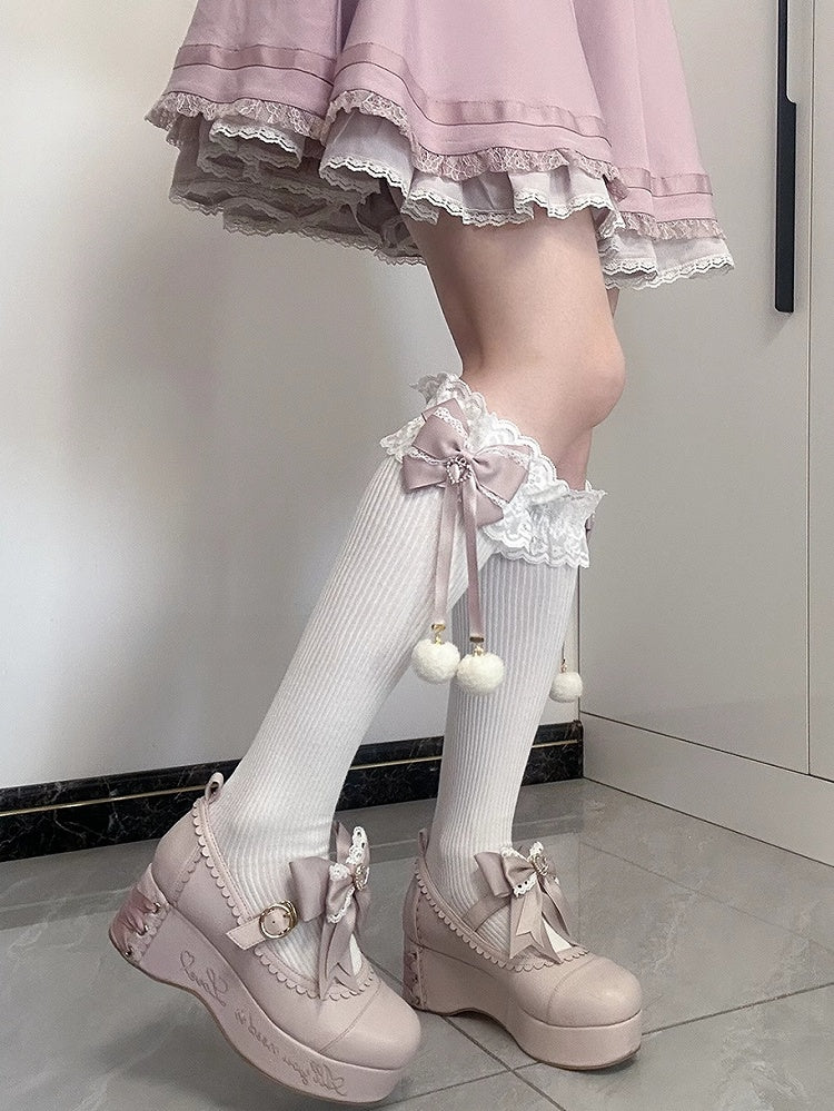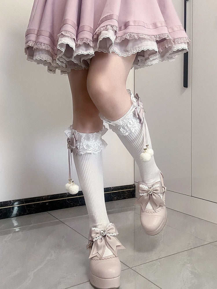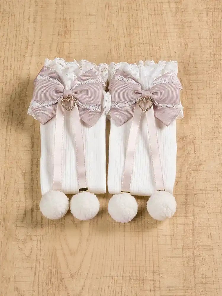 ジライケイ ポンポンディテール レースカフス 蝶結び 膝下ストッキング