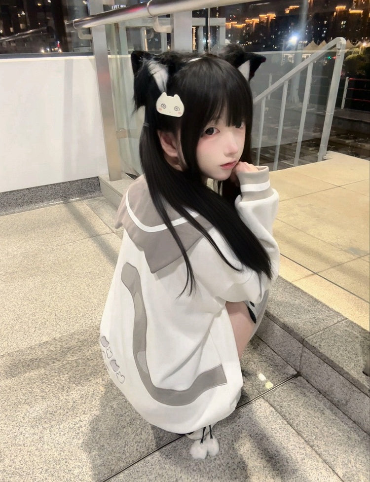 Kawaii Puff Core Cat Sailor with 3D Collar Embroidery Sweatshirt Design Otome White Gray