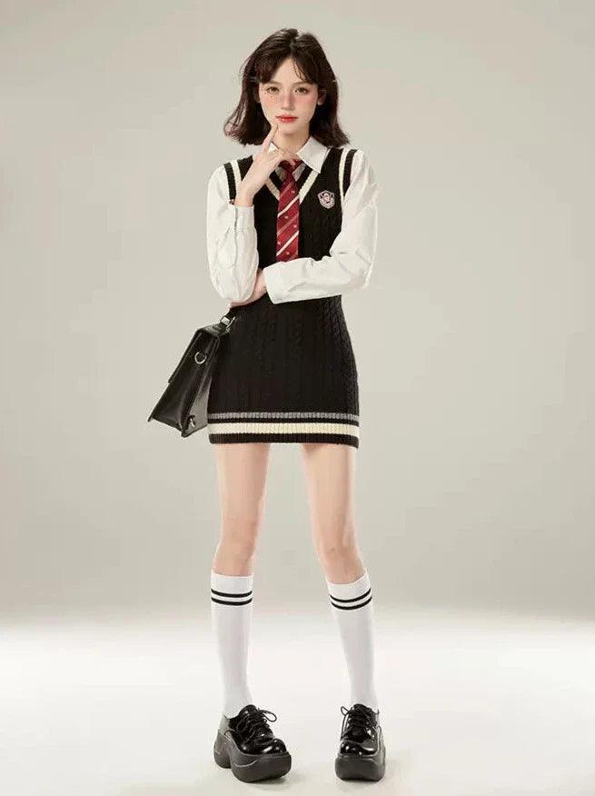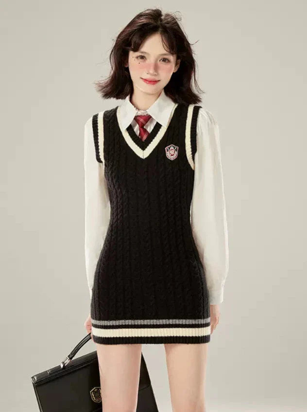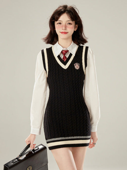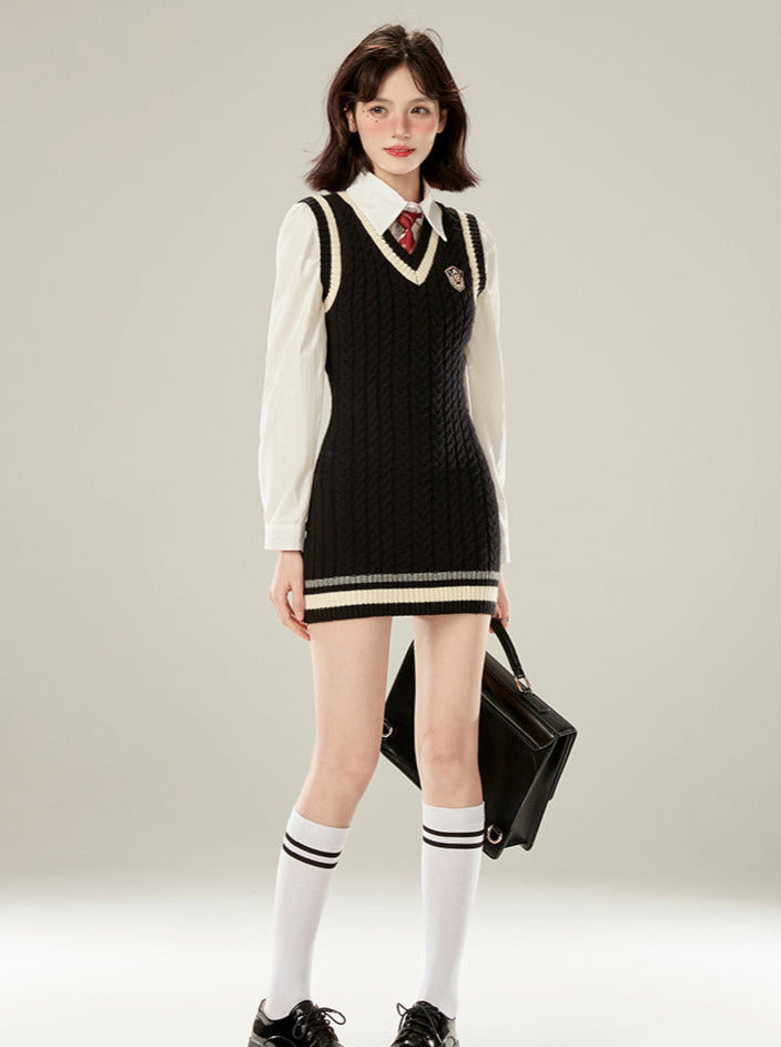 ニット + カレッジタイスタイルドレス ホワイトベスト Vネックシャツ