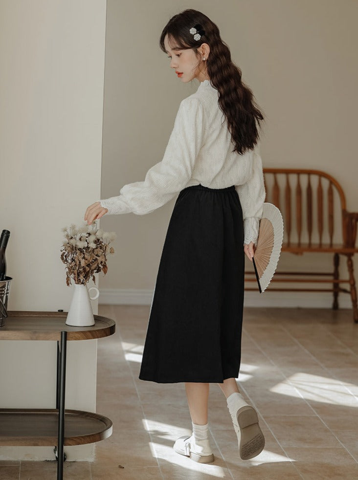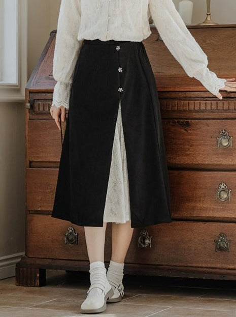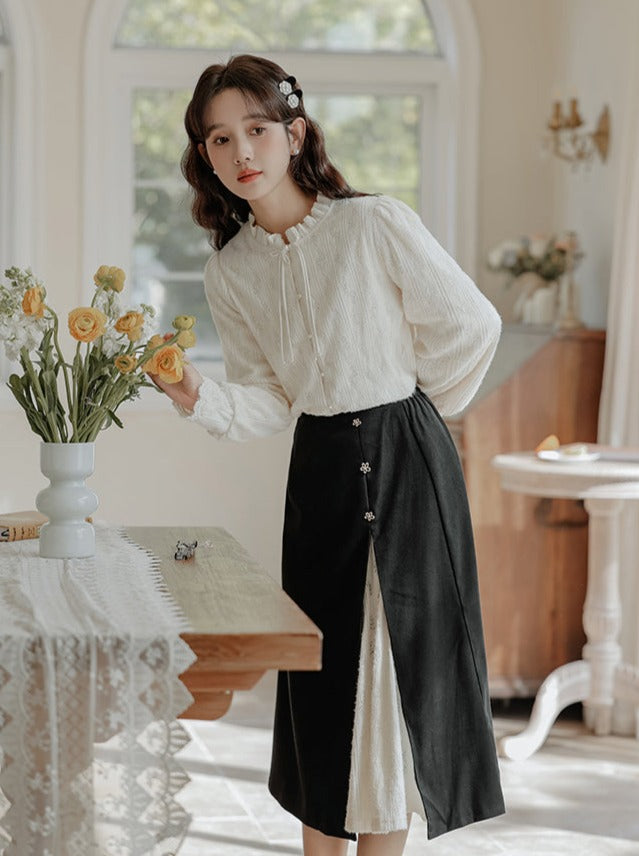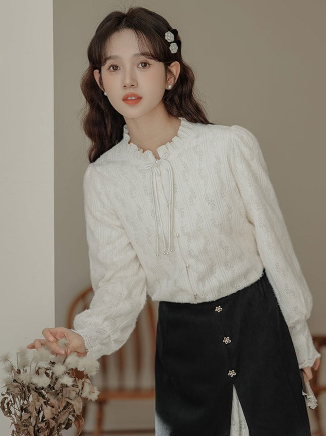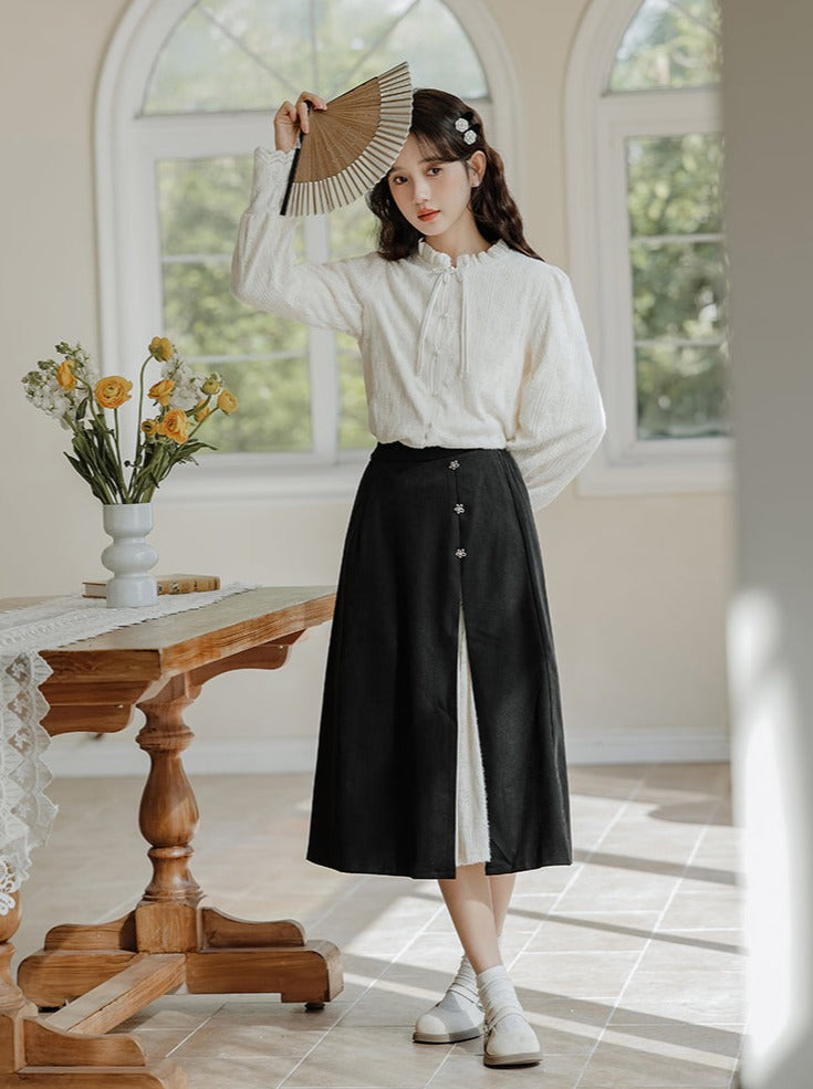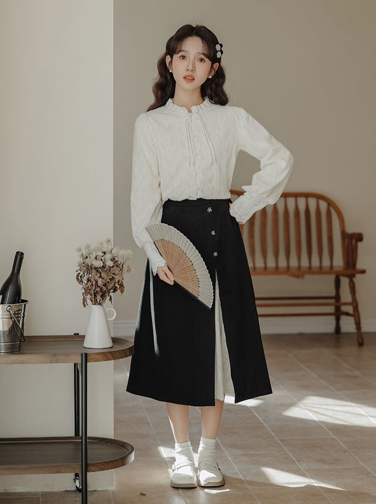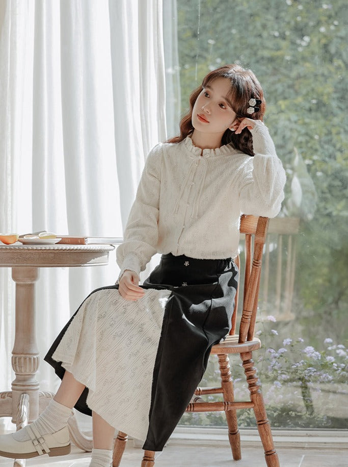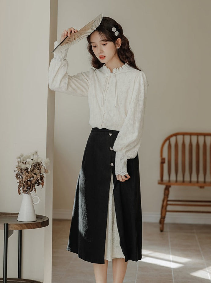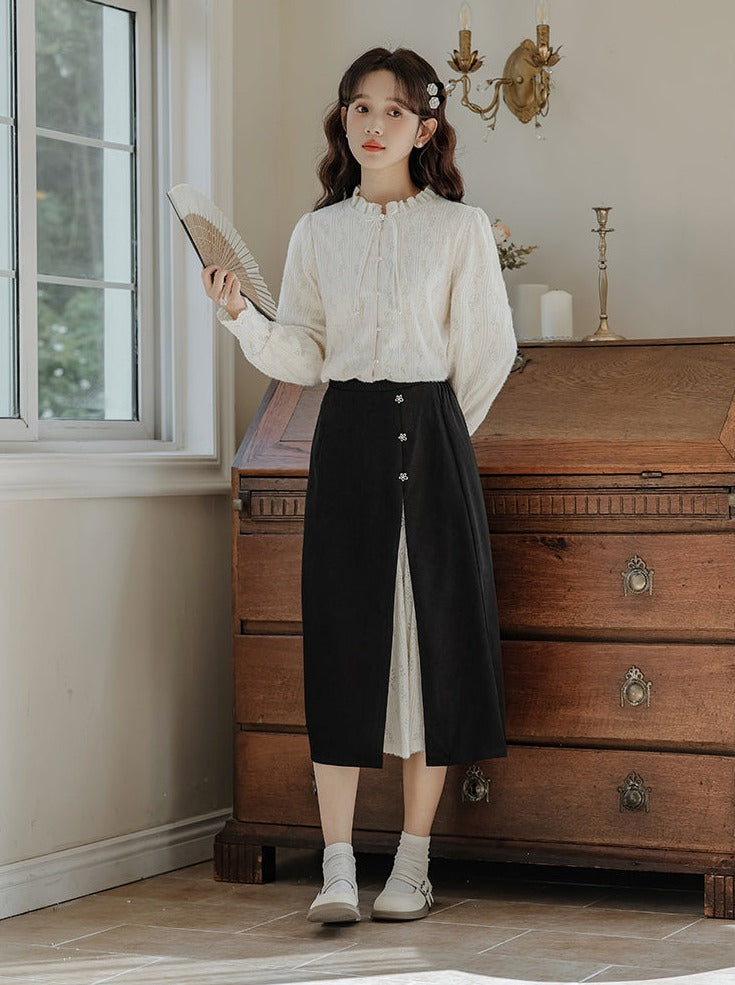 レトロなデザインと魅力的なスリットが特徴の、レースチャイナフレンチスカートシャツ。どんな装いにも可愛らしさをプラスしてくれます。