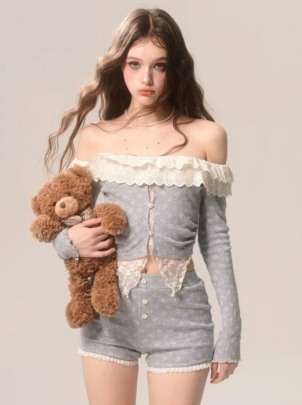 レーストップ + フレンチグレーショーツ パープルオフショルダーフローラルスーツ