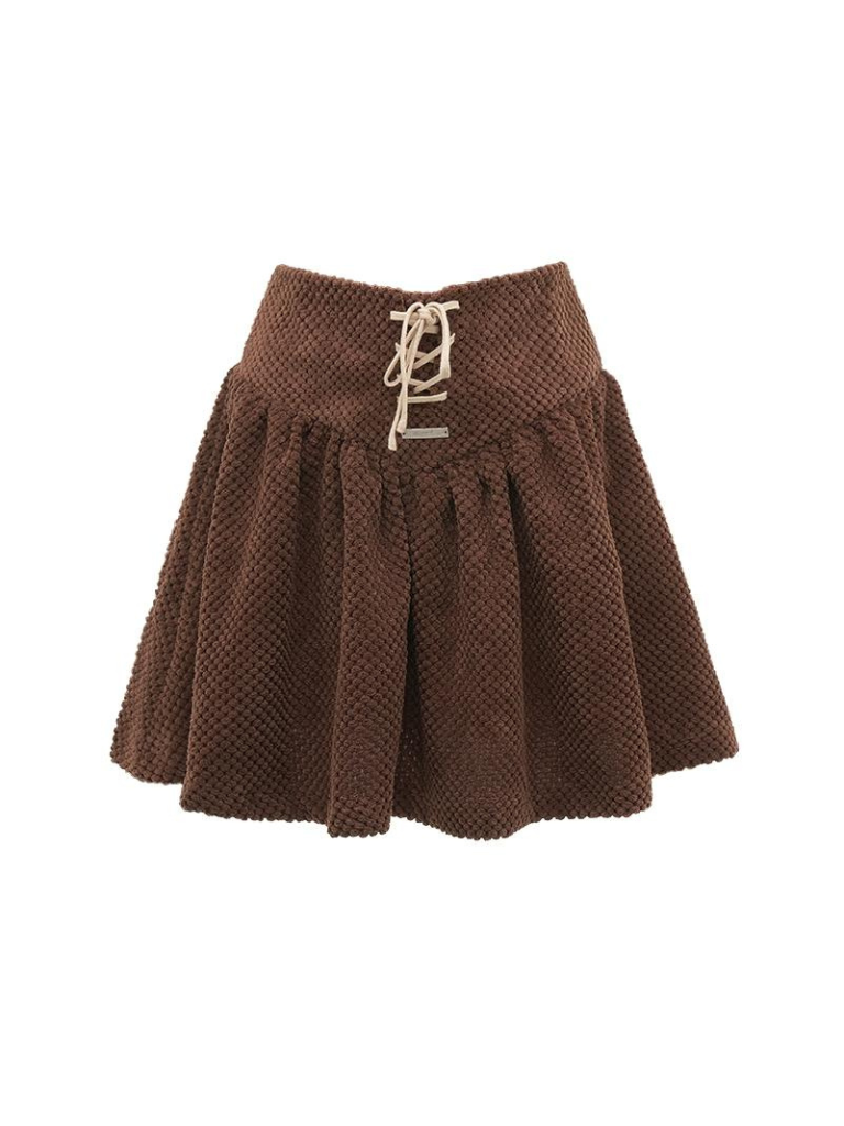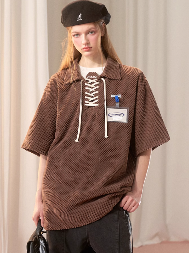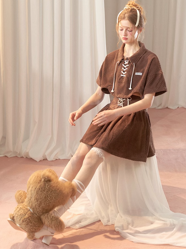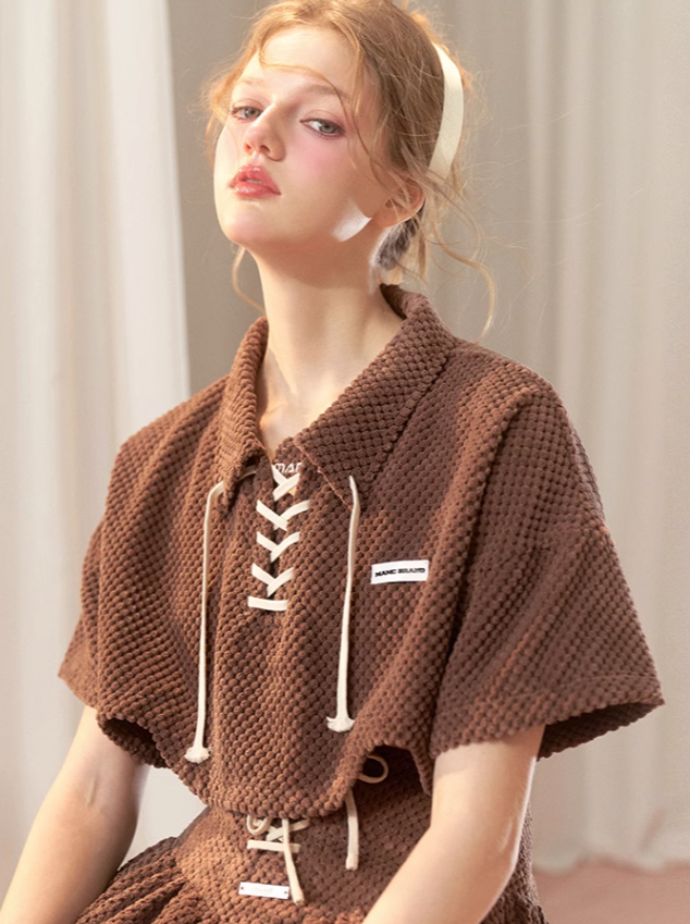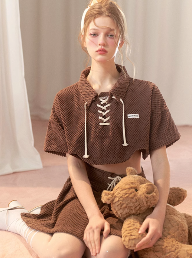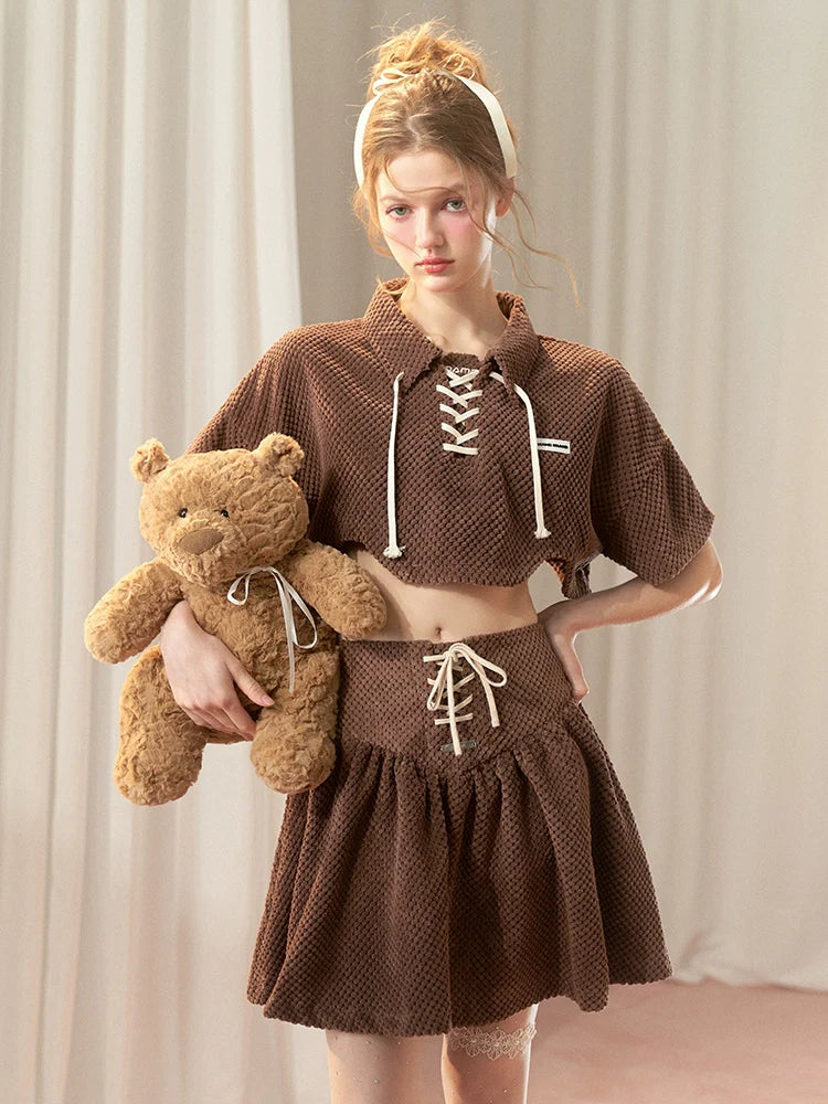 レースアップショートトップ + フレアスカート + レースアップオーバーポロTシャツ