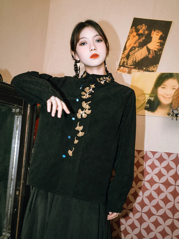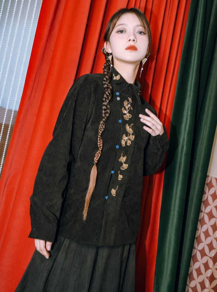 リーフレトロ刺繍シャツチャイナコーデュロイ