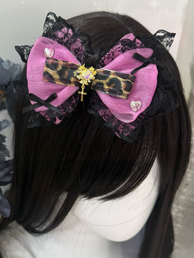 ローズレッドのヒョウ柄ラインストーンハート装飾レーストリム蝶結びヘアクリップ