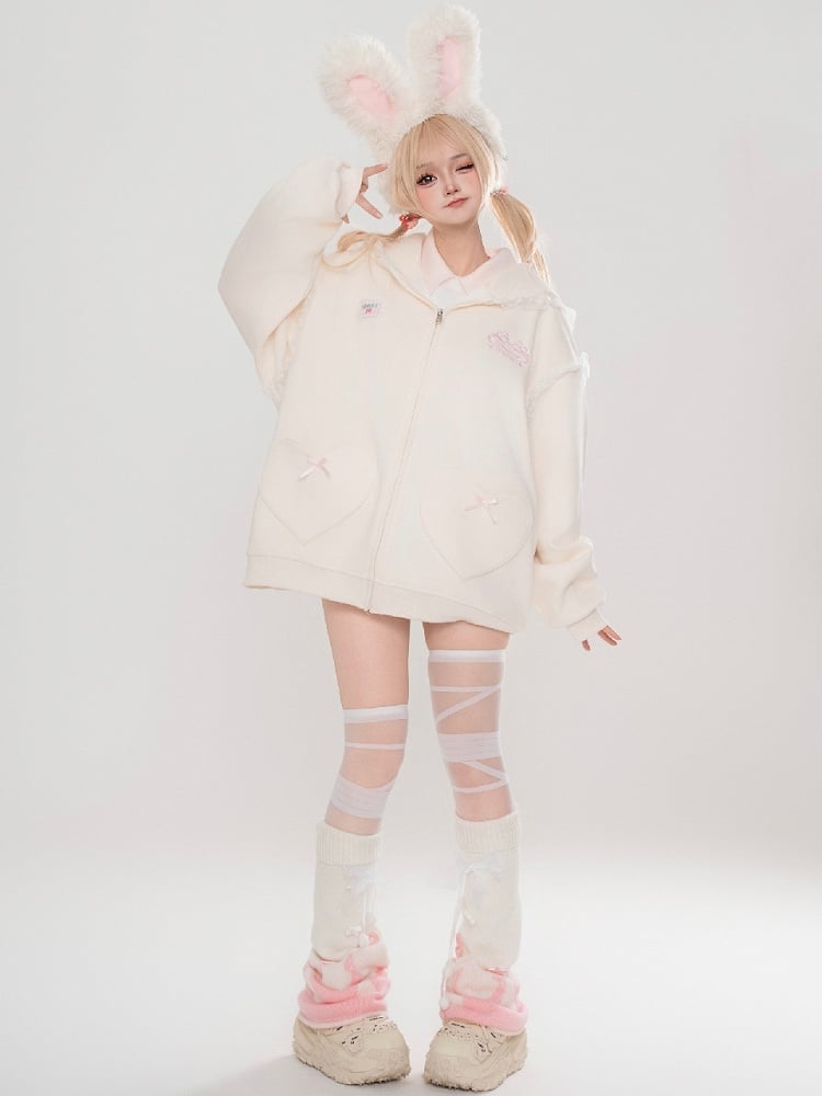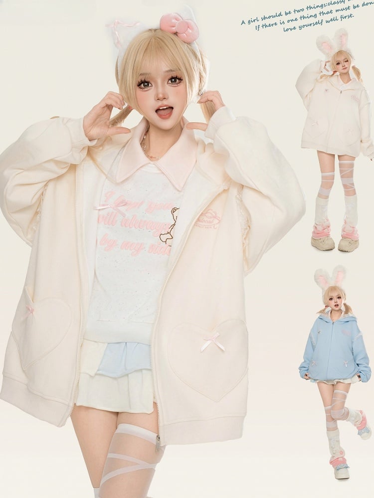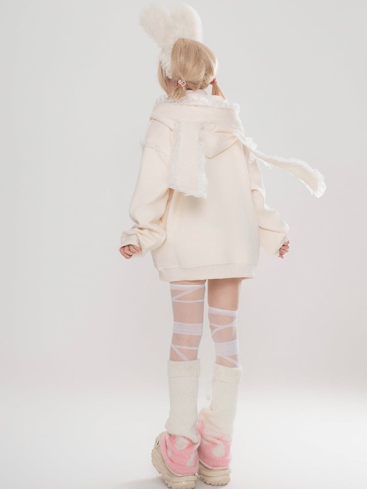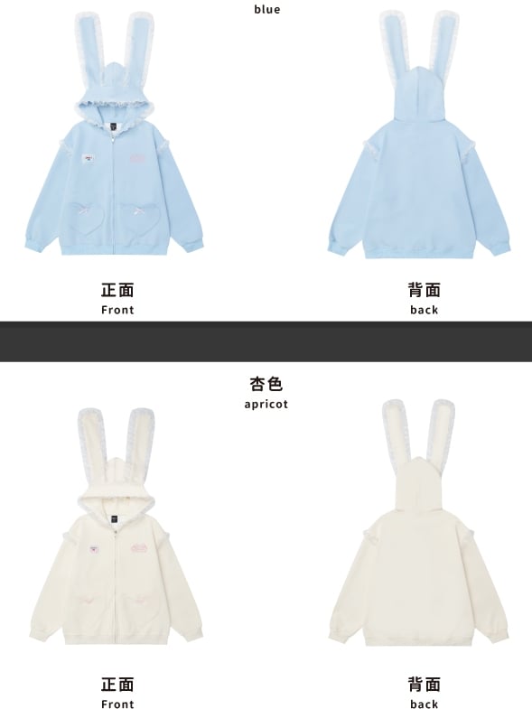 ライトブルーとアプリコットのウサギ耳デザインと繊細なレースのアクセントが特徴の、愛らしいパーカーです。ジップアップでぴったりフィットし、スタイリッシュな着心地を実現。どんなコーディネートにもキュートなアクセントを添えてくれます。
