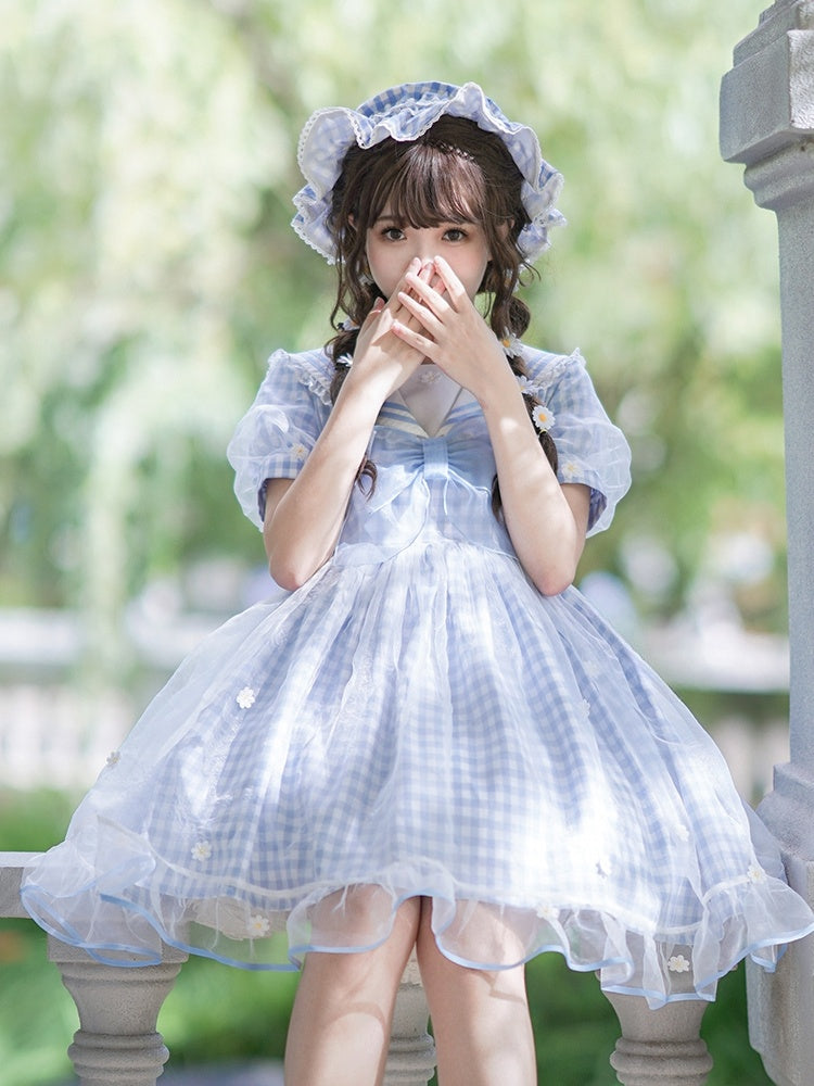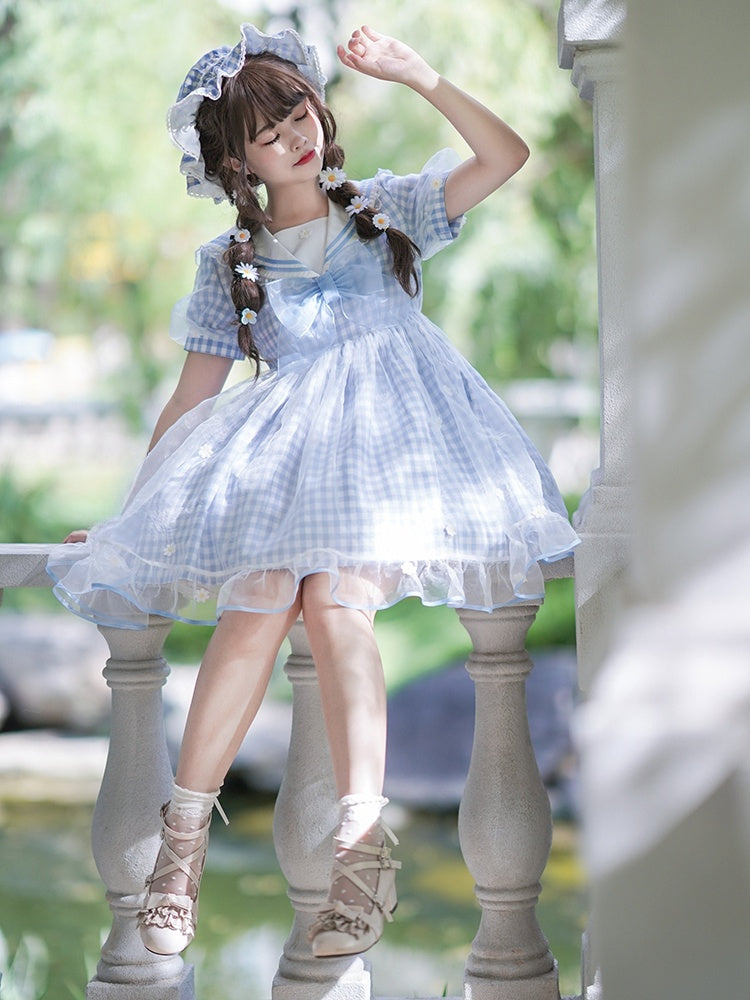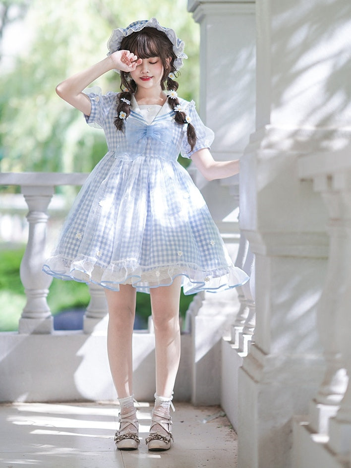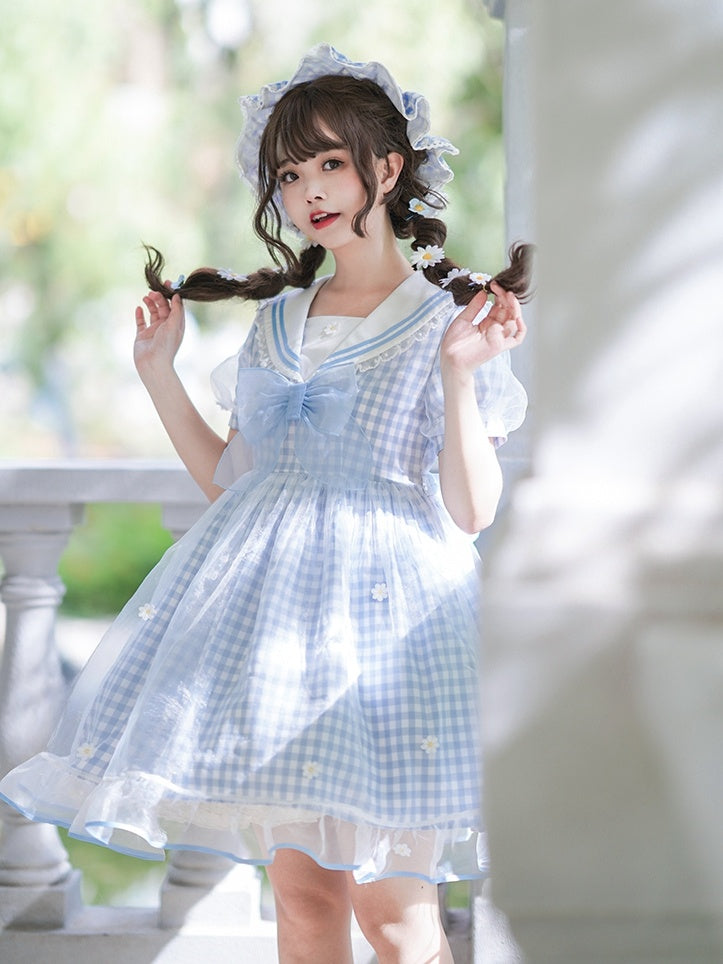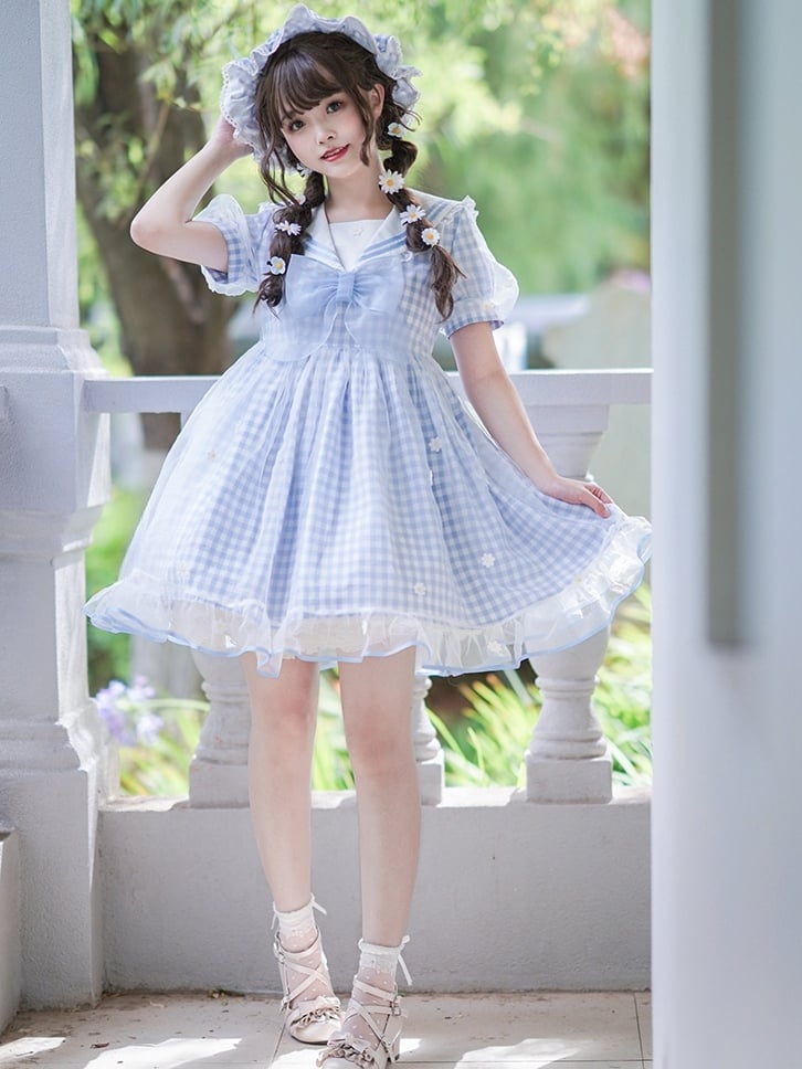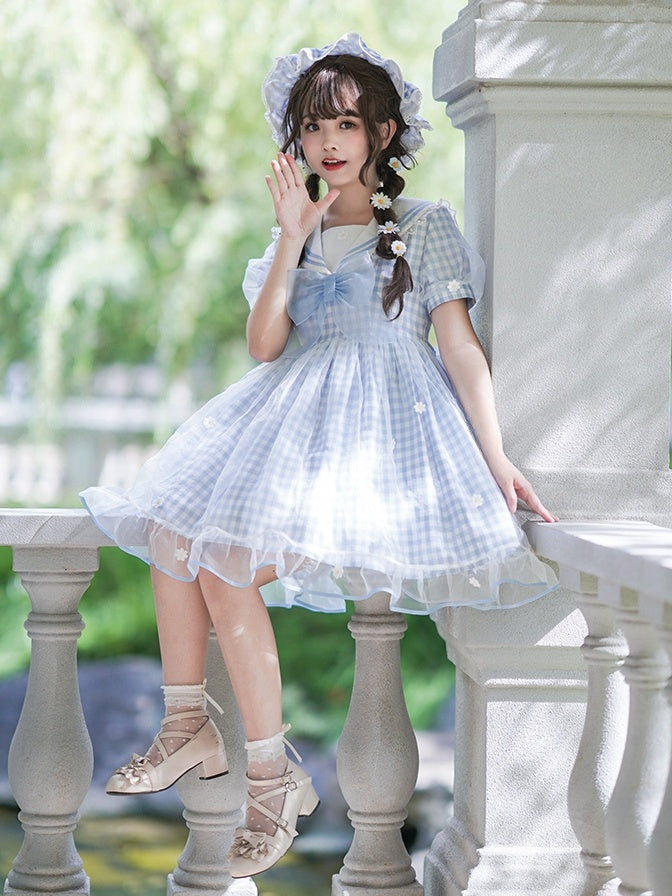 ライトブルーのセーラーカラー、白いデイジー柄のチェック柄、リボンディテールのスイートドレス